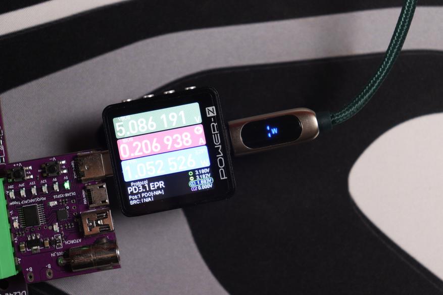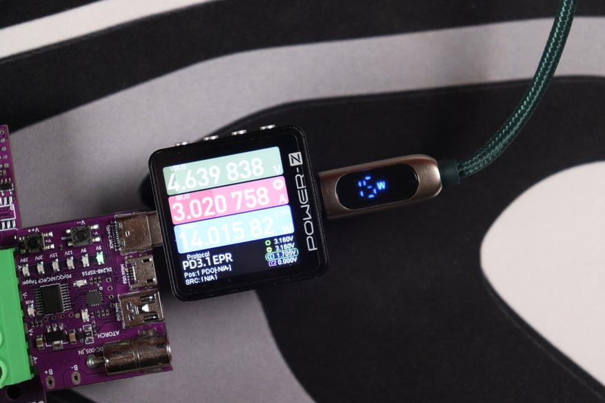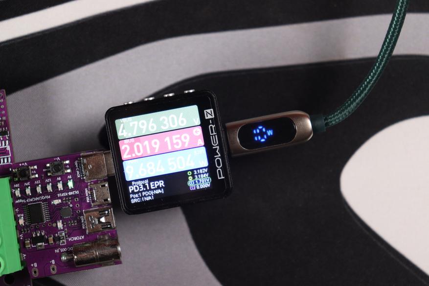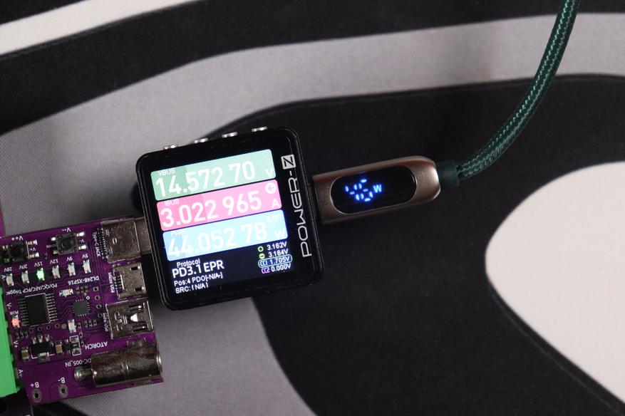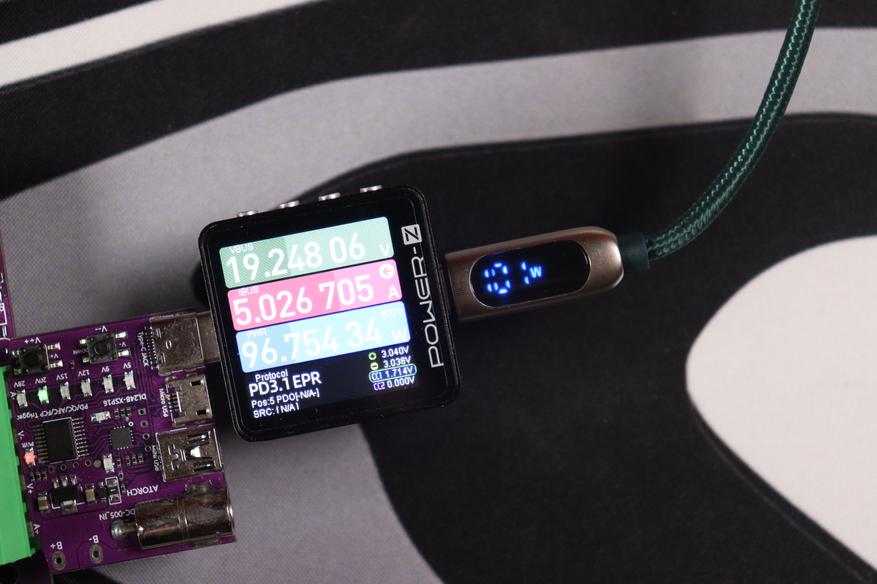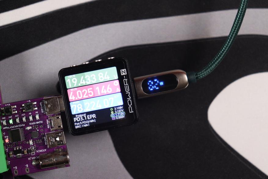 Кабeль поддерживает PD 3.0, успешно договаривается на профили 20V 5A (100Вт). В процессе тестирования удалось получить стабильные показатели: напряжение держится в районе 19-20V, ток достигает 4-5A в зависимости от нагрузки. Встроенный дисплей показывает данные с минимальной задержкой, совпадение с показаниями внешнего тестера практически идеальное.