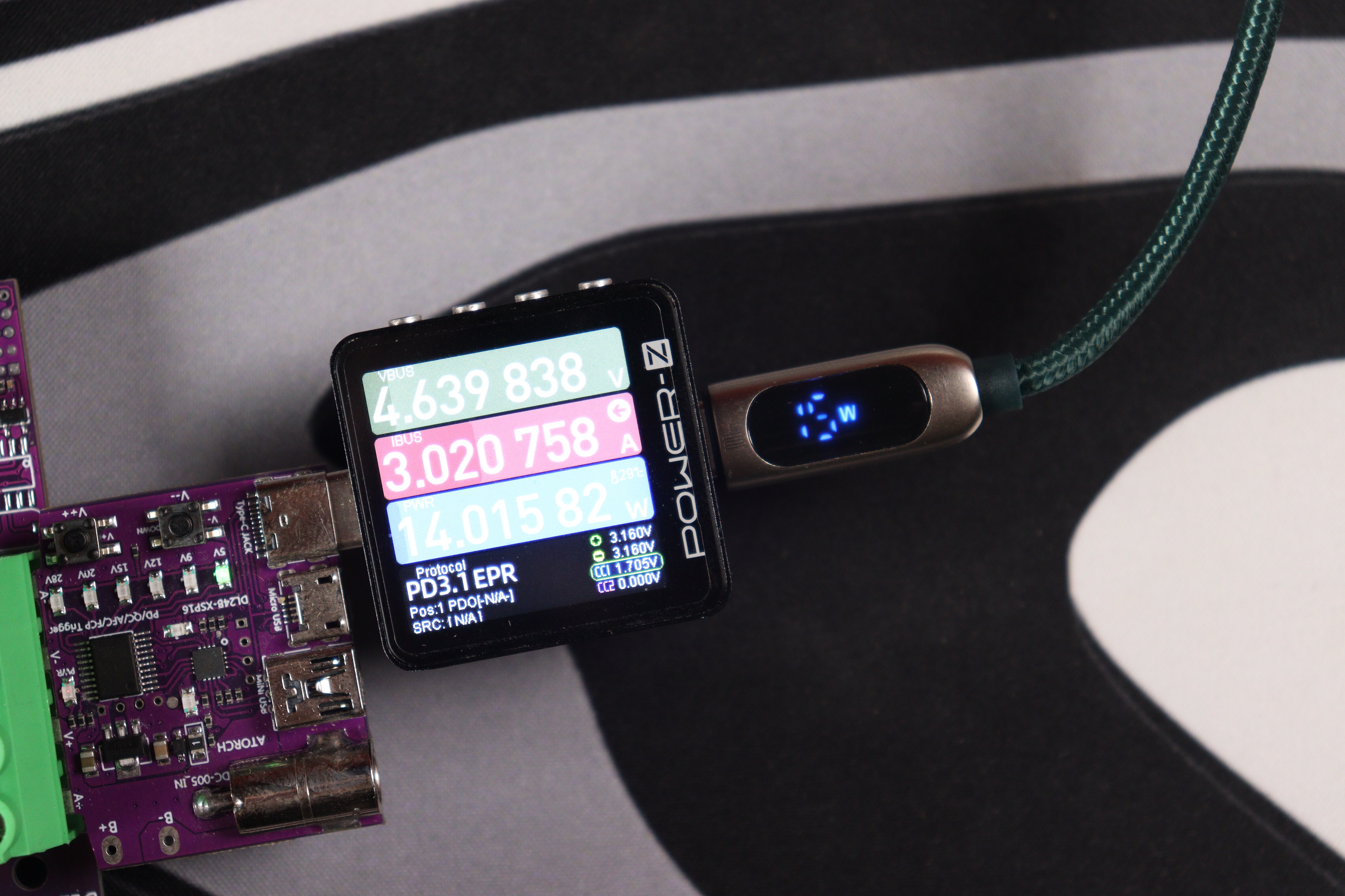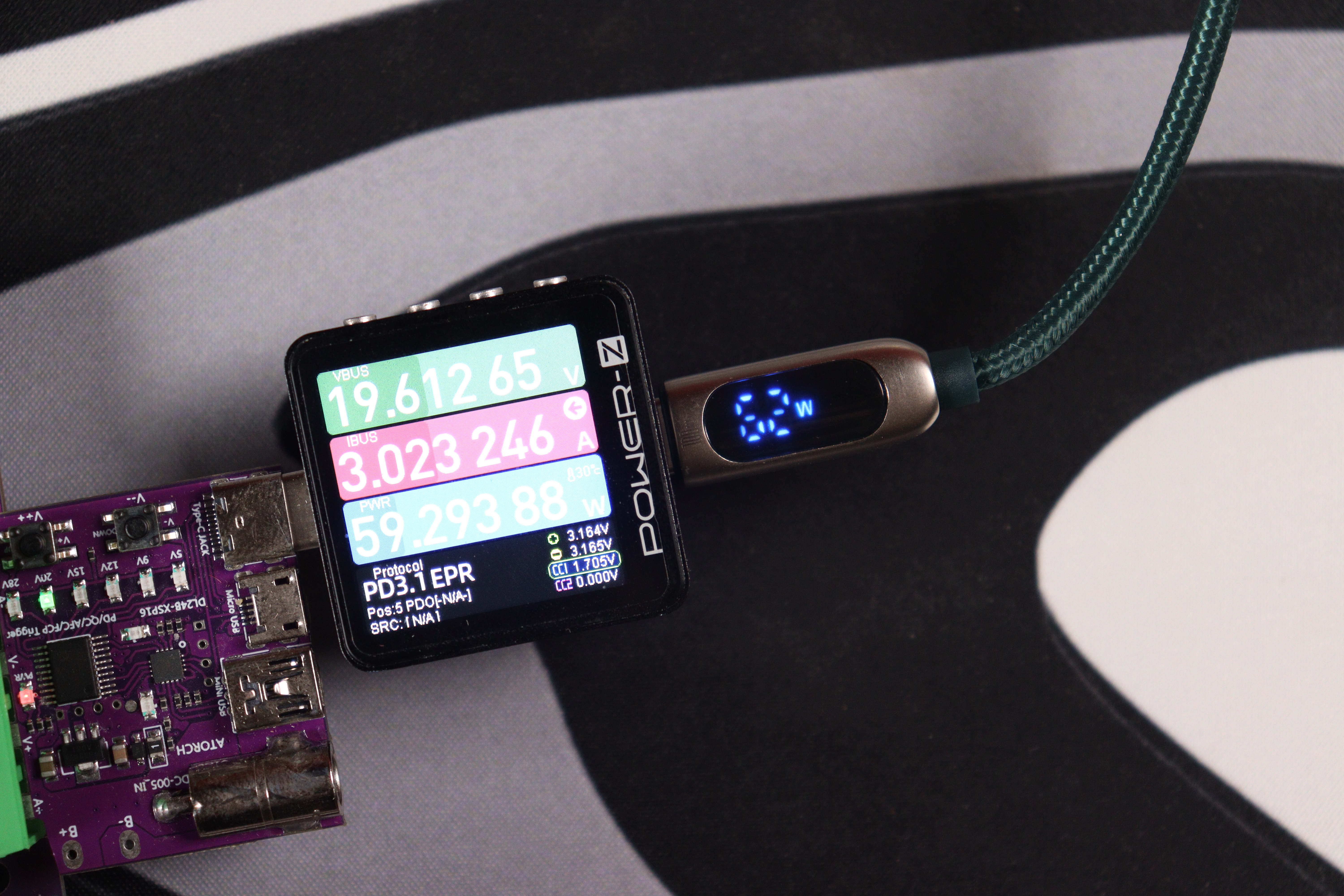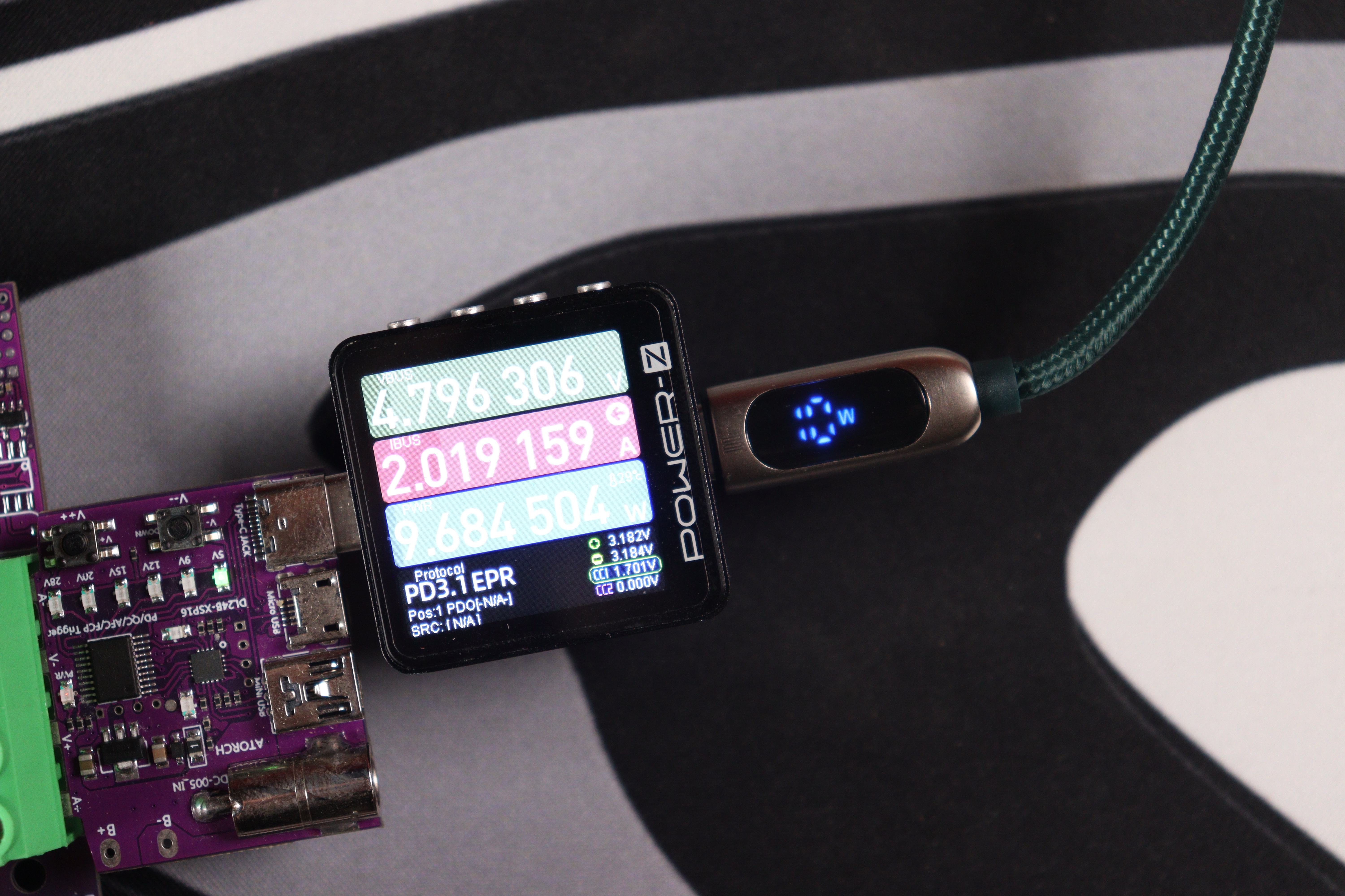 Кабeль поддерживает PD 3.0, успешно договаривается на профили 20V 5A (100Вт). В процессе тестирования удалось получить стабильные показатели: напряжение держится в районе 19-20V, ток достигает 4-5A в зависимости от нагрузки. Встроенный дисплей показывает данные с минимальной задержкой, совпадение с показаниями внешнего тестера практически идеальное.