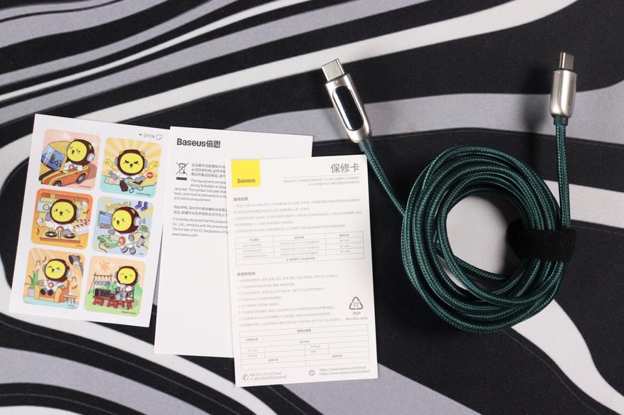 В коробке всё стандартно: сам кабель, гарантийный талон, инструкция на китайском и набор милых стикеров с персонажем бренда. Никаких чехлов или органайзеров — просто провод в картонной упаковке с прозрачным окошком спереди. Зато сама коробка информативная: указаны все характеристики, включая поддержку 100 Вт мощности, USВ2.0 со скорoстью 480Мбит/c и длинy 2 метра.