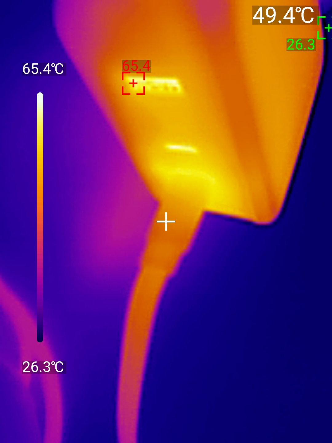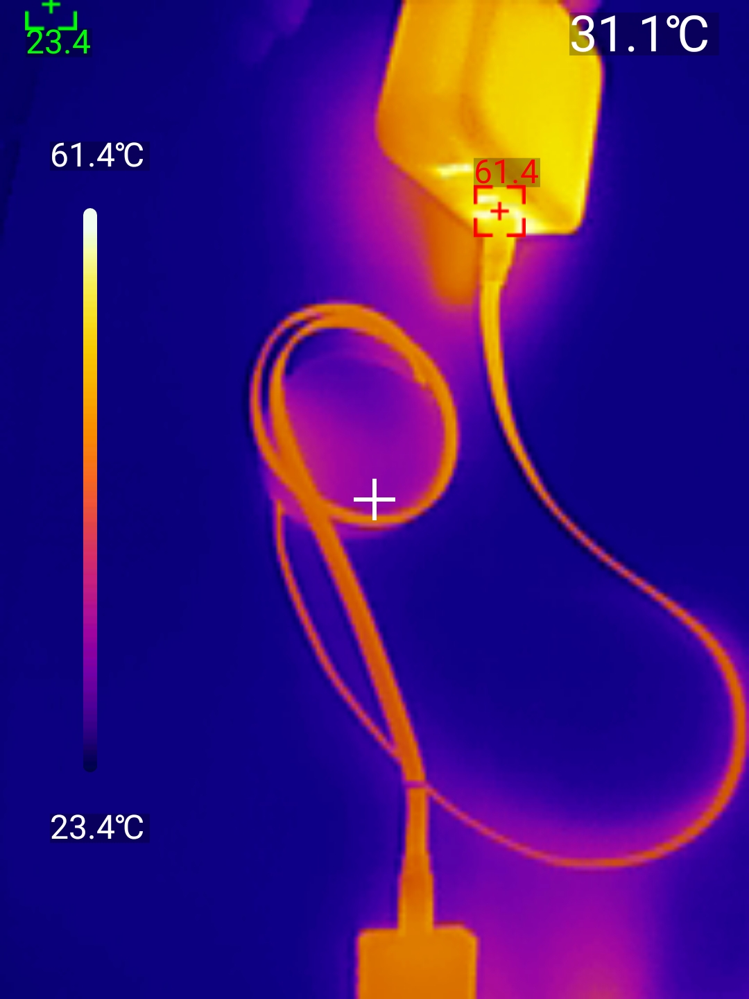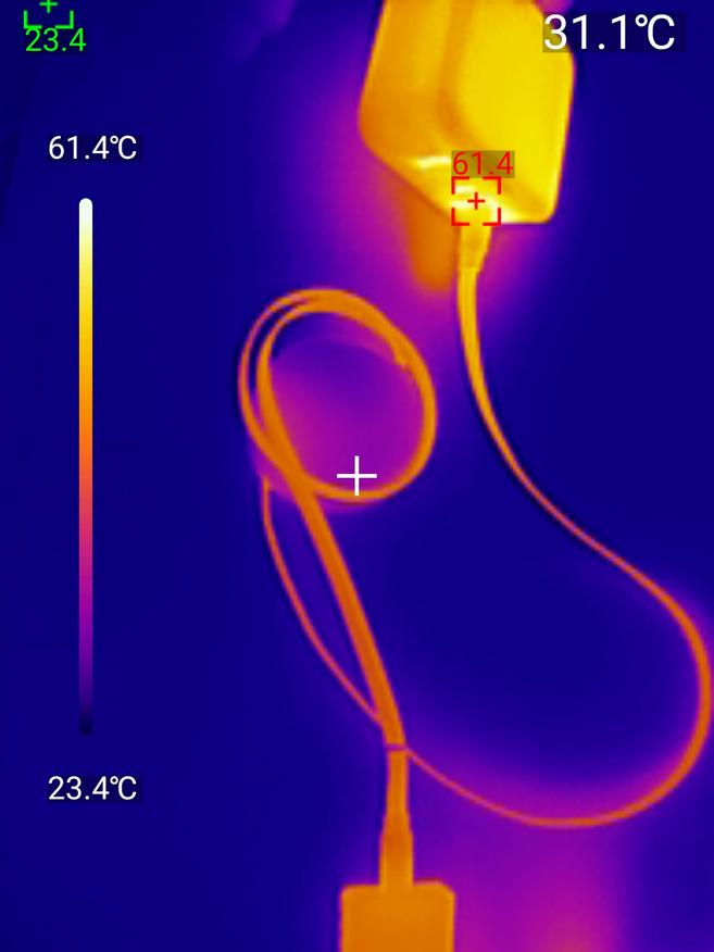 Основное предназначение кабеля — зарядка. Заявленные 100 Вт (20V/5A) он выдаёт без проблем. Подключил через него ноутбук с потреблением около 100 Вт, зарядка пошла стабильно. Через час работы на максимальной мощности измерил температуру тепловизором: коннектор нагрелся до 49.4°C, сам корпус катушки — до 31.1°C. Это тёплый и не критичный уровень. Кабель продолжал работать без сбоев, и пластик не начал плавиться или издавать запахи.