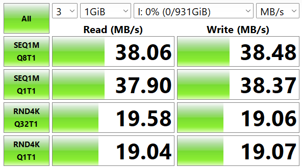 Начнём с данных. Подключил кабель между ноутбуком и внешним SSD Ugreen CM559, запустил CrystalDiskMark. Результаты оказались вполне достойными: последовательное чтение — 38.06 МБ/с, запись — 38.48 МБ/с. В тестах SEQ1M Q1T1 показатели чуть ниже: 37.90 МБ/с на чтение и 38.37 МБ/с на запись. Случайные операции 4K ожидаемо медленнее: около 19 МБ/с в обе стороны.