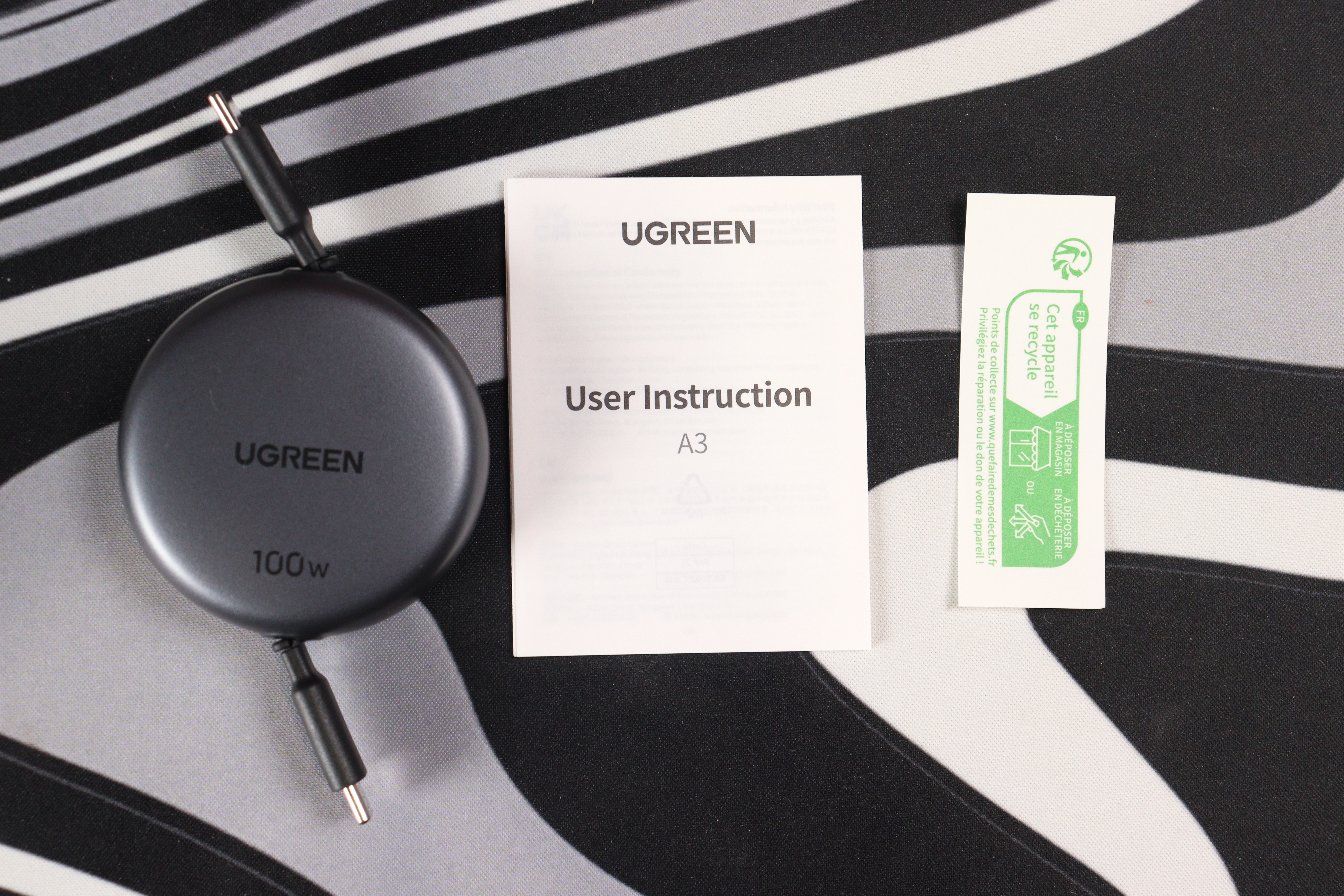Всё предельно минималистично. Кабель упакован в фирменную коробку UGREEN c изображением товара. Внутри — только кабель и инструкция на нескольких языках.
