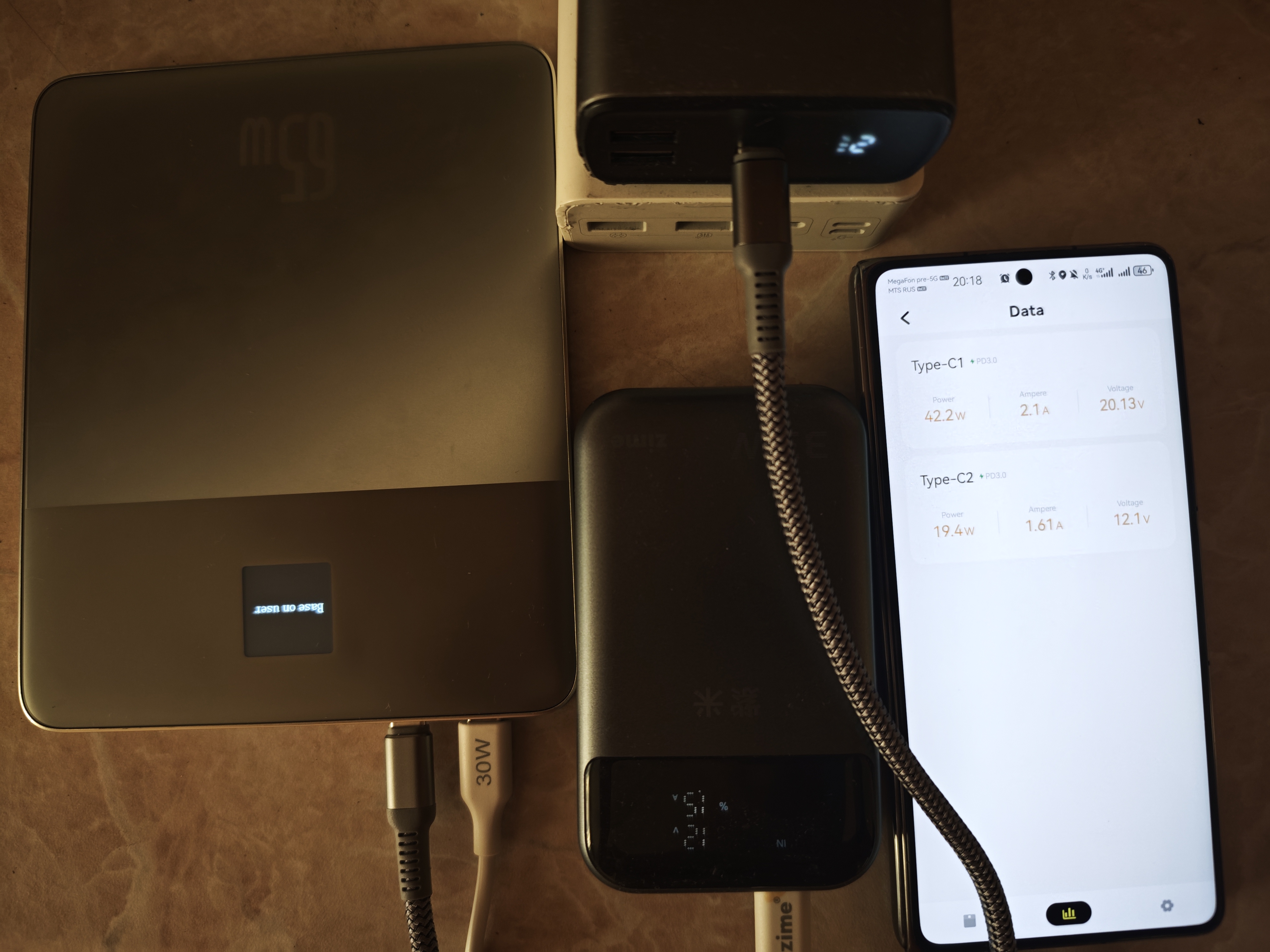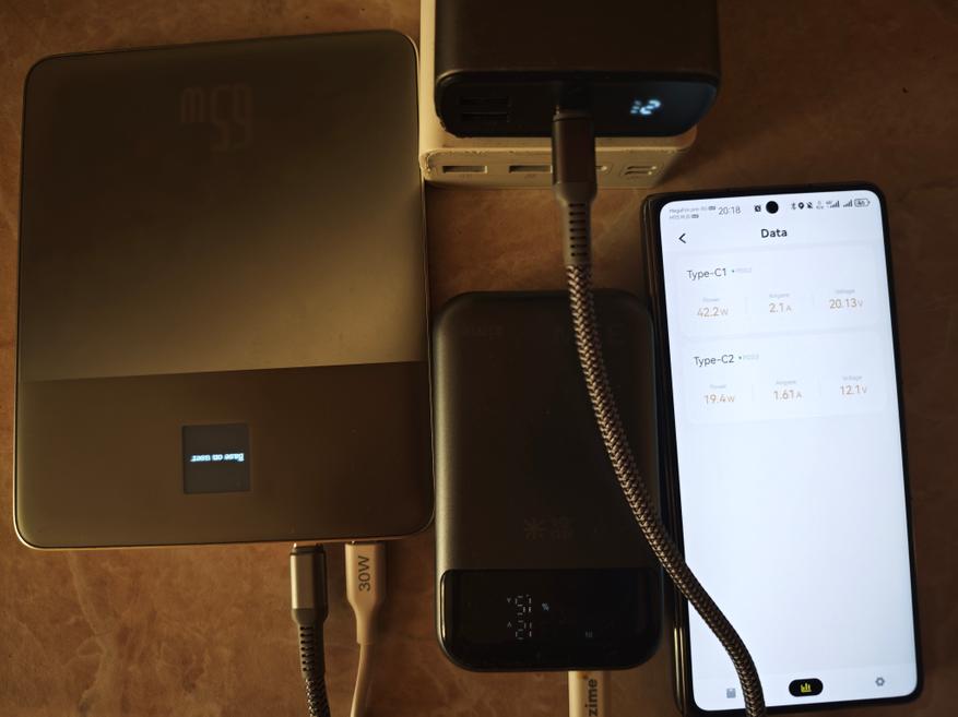 На следующих фотографиях показал, что приложение Baseus само определило повербанк. На второй фотографии показал заряд двух других внешних аккумуляторов через два порта в режиме 45Вт + 20Вт.