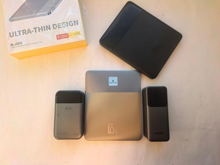 На следующих фотографиях сравнил Blade 2 с 65Вт аккумулятором Zime, 100Вт Ugreen PB724 и 100Вт Baseus Blade. Сложно сказать, какой из них займет меньше места в сумке. Инстинктивно кажется, что это тонкая модификации Baseus Blade.