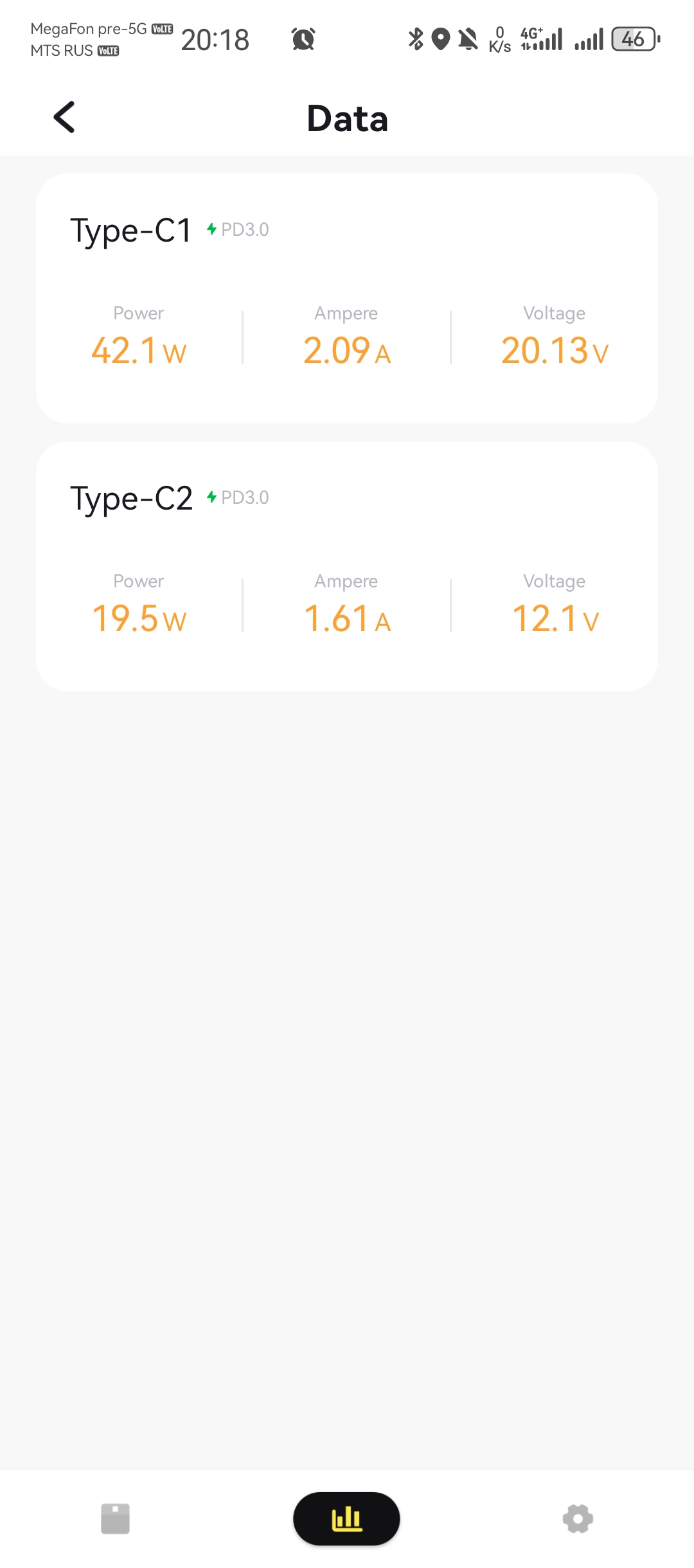 Модель имеет два порта, каждый из которых может отдавать энергию на быстрых протоколах по отдельности. Суммарная мощность ограничена по напряжению и току на уровне 5V/6A, если не используется быстрый режим. Суммарная мощность от двух портов может составить 65Вт, в разбивке по 45Вт и по 20Вт с каждого,