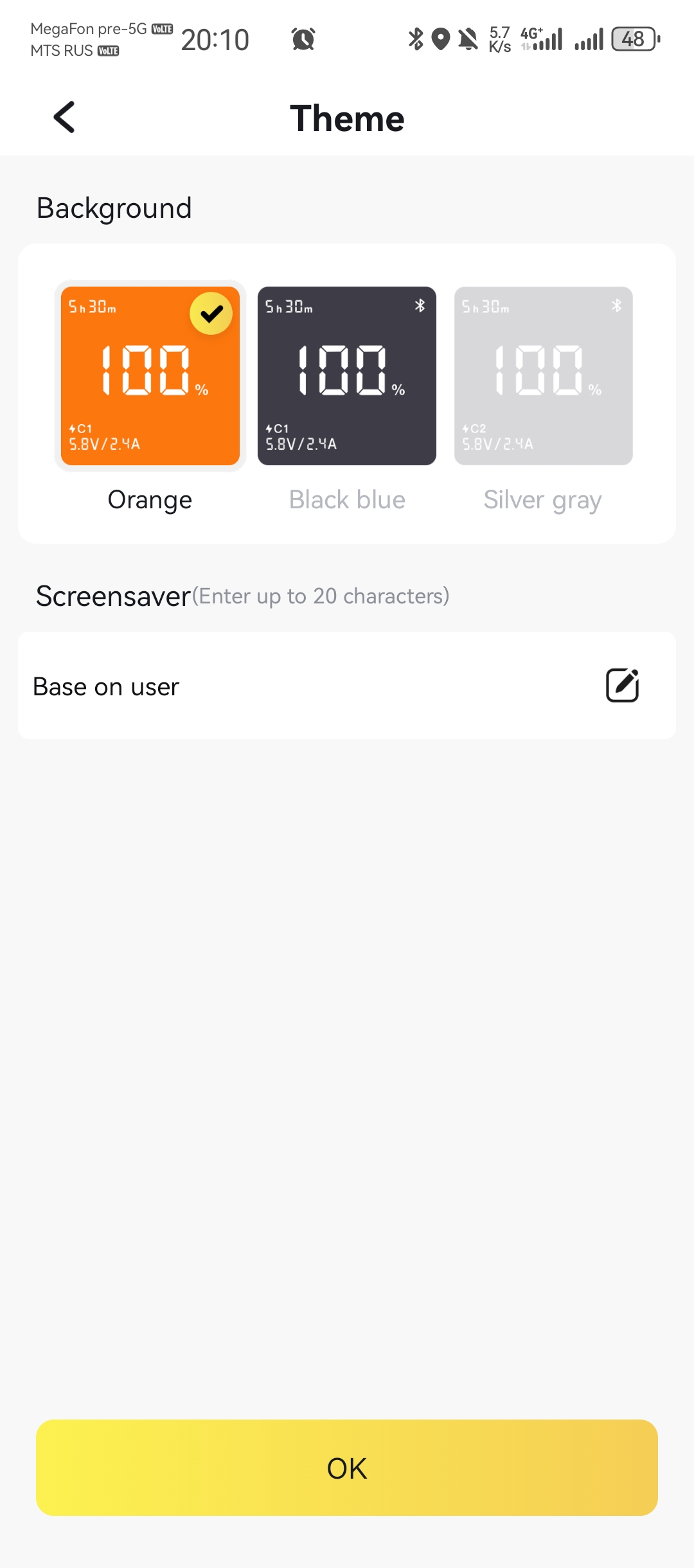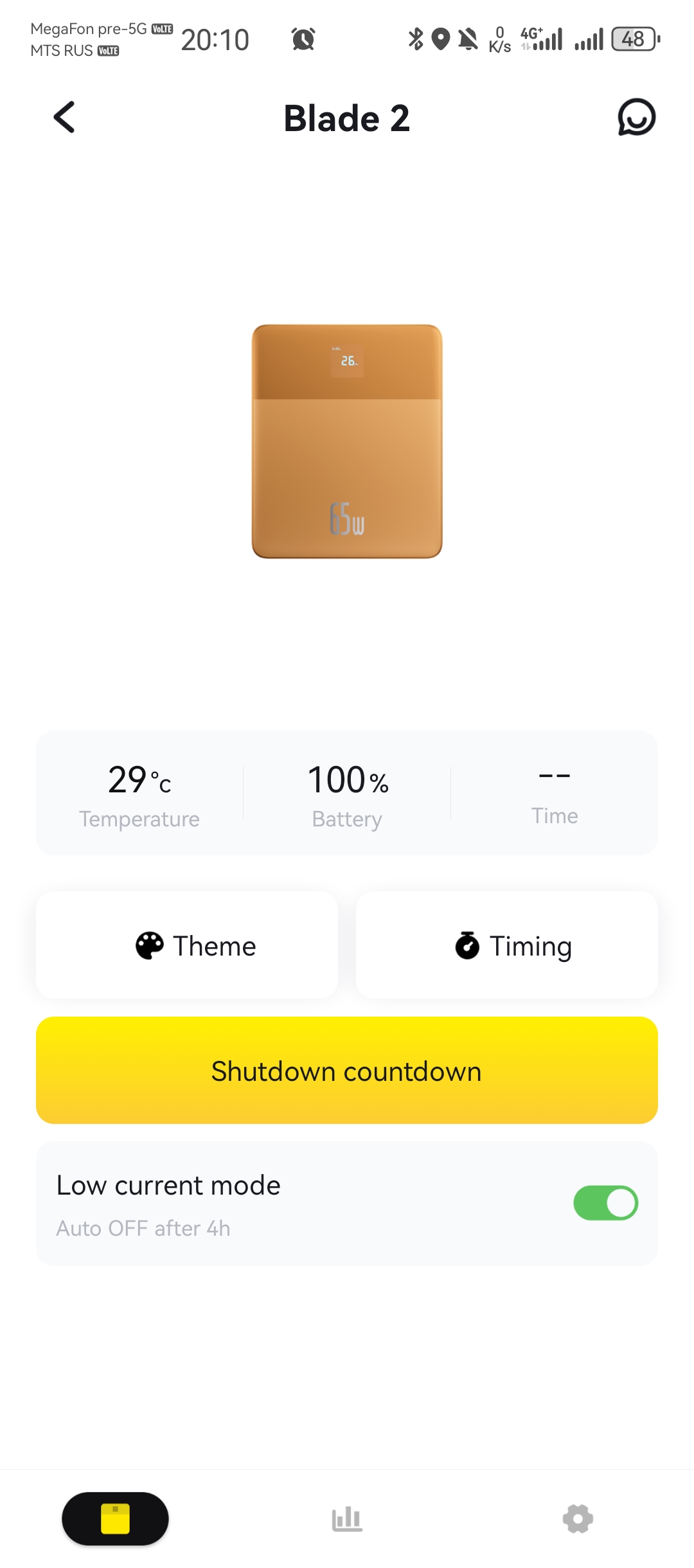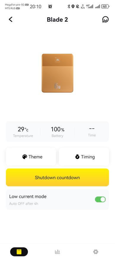 Управлять аккумулятором можнл через приложение, что выглядит необычным для меня. Интересно, что Baseus в этом плане отличается от других брендов, интегрирует пользователя в свою экосистему. Товар определился в приложении, правда другого цвета. Можно менять как подсветку экрана, так и надпись при включении, сменив слоган бренда «Base on user» на свой. Можно поставить таймер на отключение. Это важная опция, например при зарядке: чтобы он не перезарядился, можно выключить заряд по истечении определенного времени. Также можно видеть, на каких напряжениях и силе тока проходит разряд. На четвертом скриншоте показана такая информация. По ней видно, что режим 45Вт + 20Вт работает. Аккумулятор способен разряжаться на двух быстрых протоколах через каждый из двух портов.