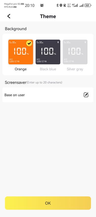 При нажатии на кнопку включается дисплей. В момент заряда на нем отображается информация по напряжению и силе тока. Экран и надпись на нем можно изменить через приложение.