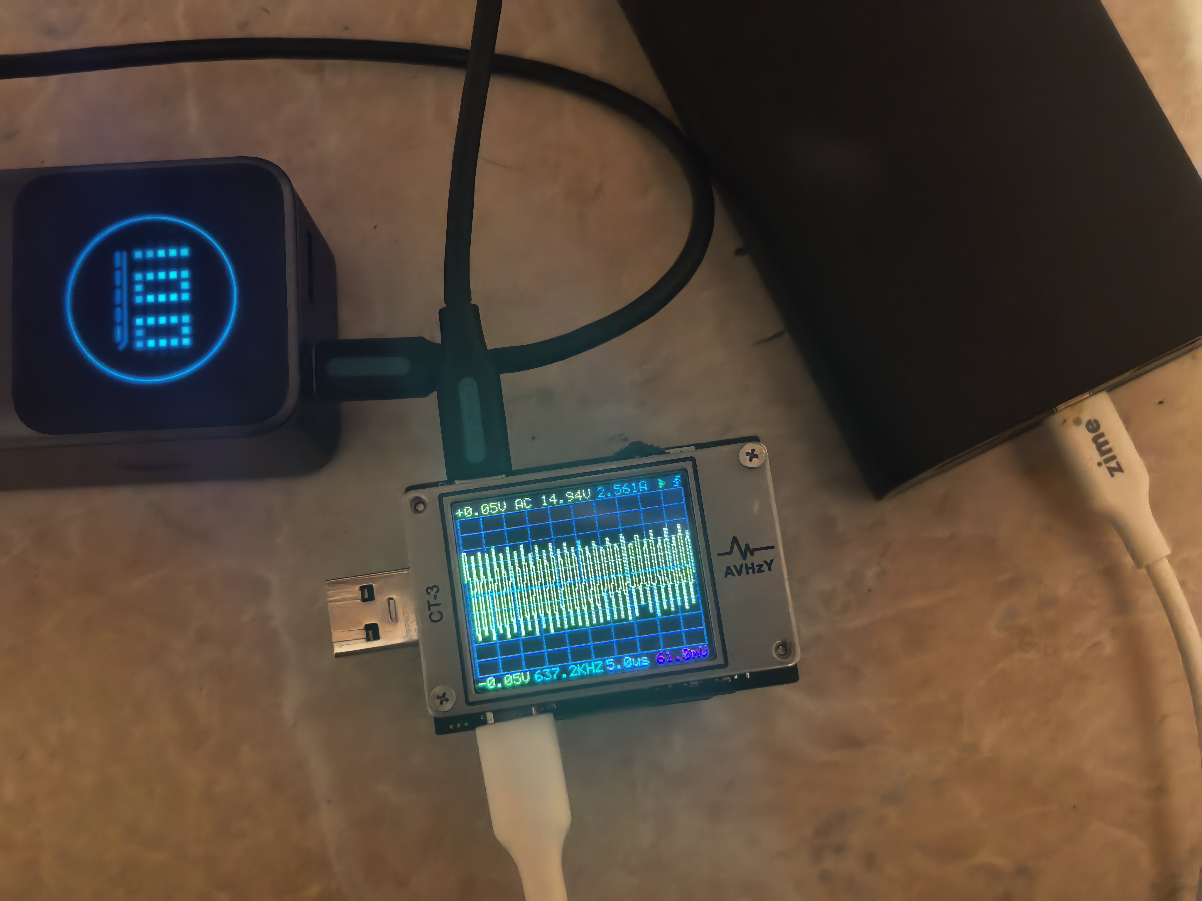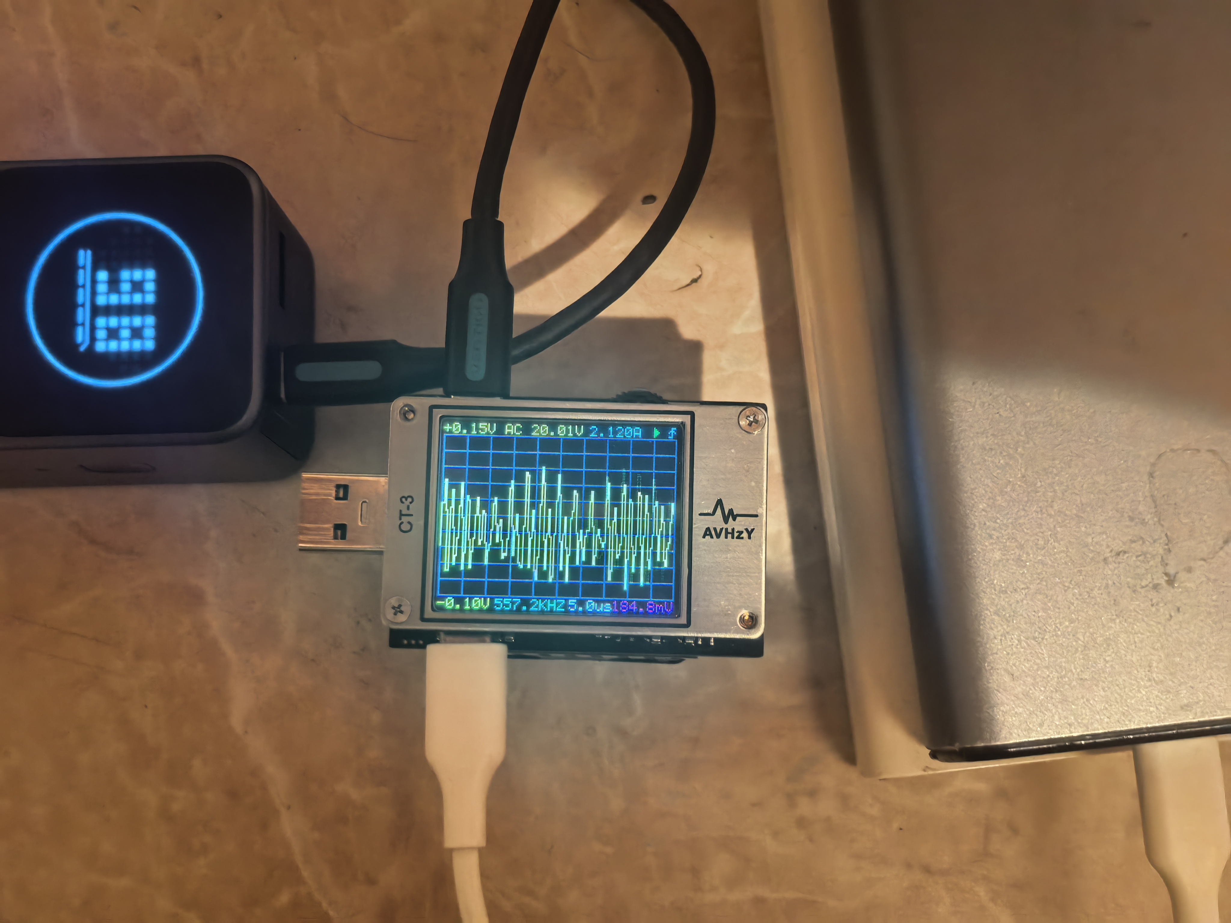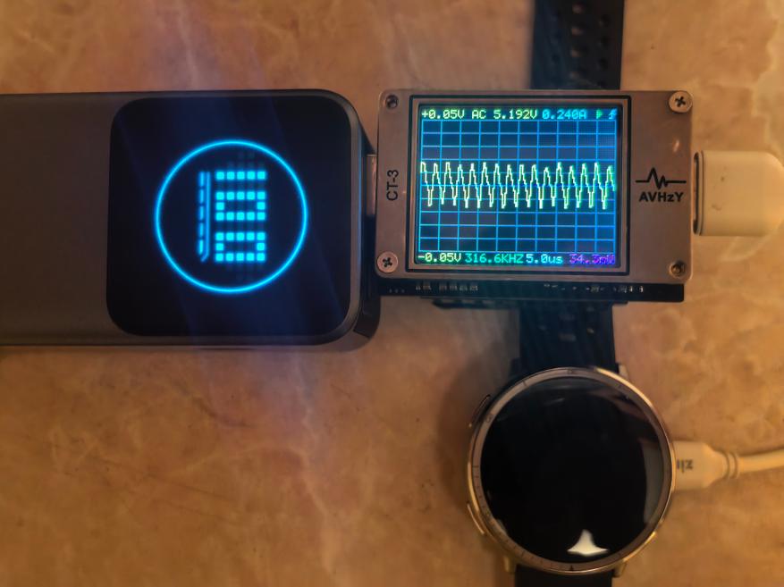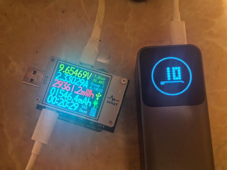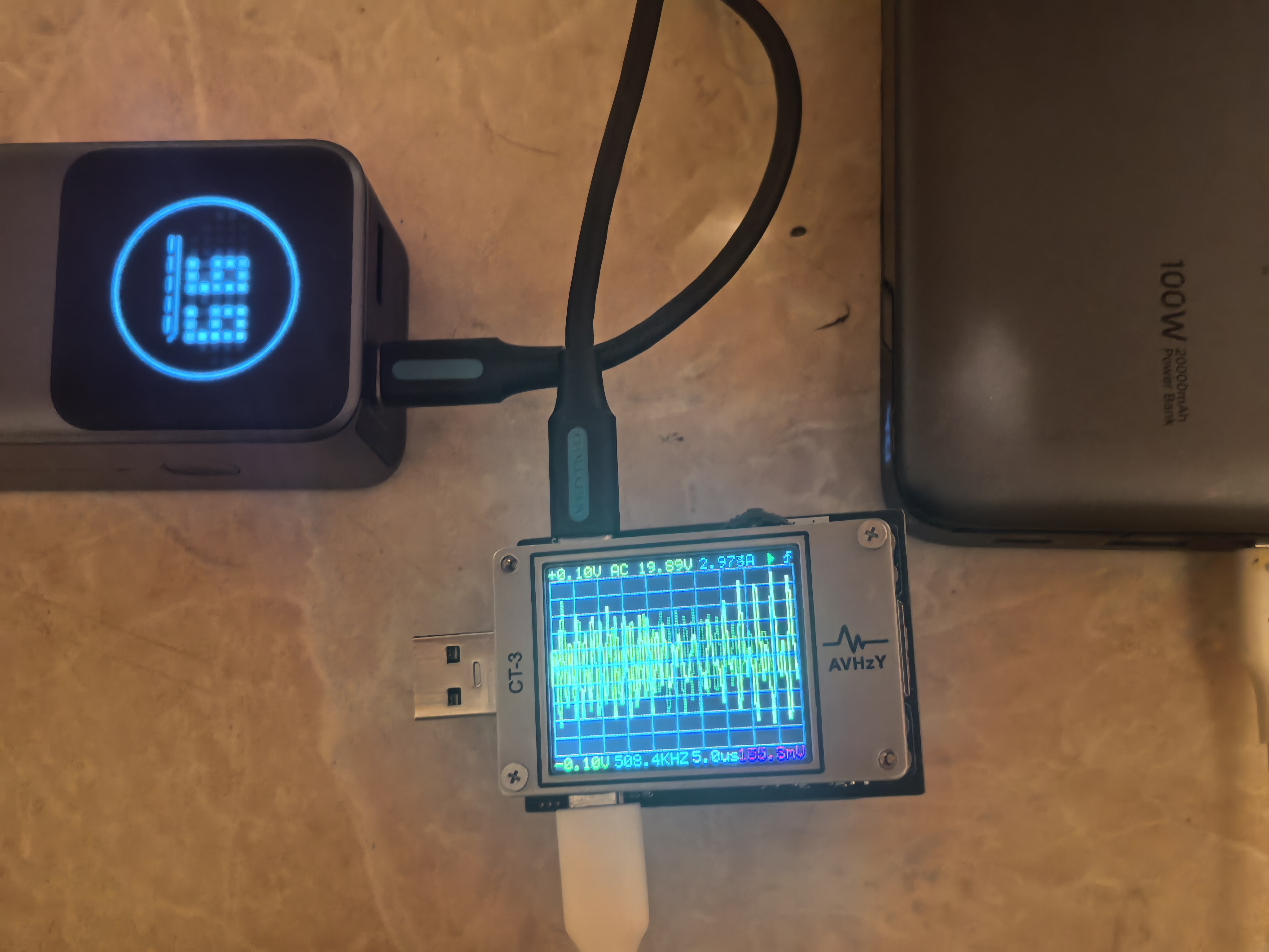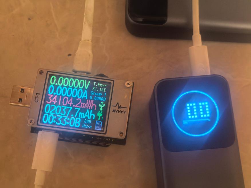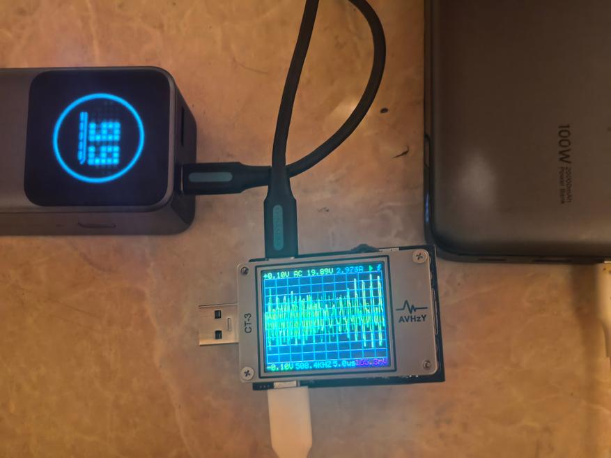 Оценка пульсаций тестером AVHzY CT-3 показала, что их уровень не превышает 1%. В большинстве своем он находится ниже. Через внешний аккумулятор можно без проблем заряжать как что-то мощное, так и носимую электронику.