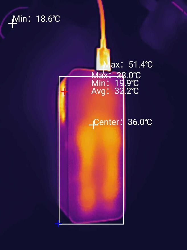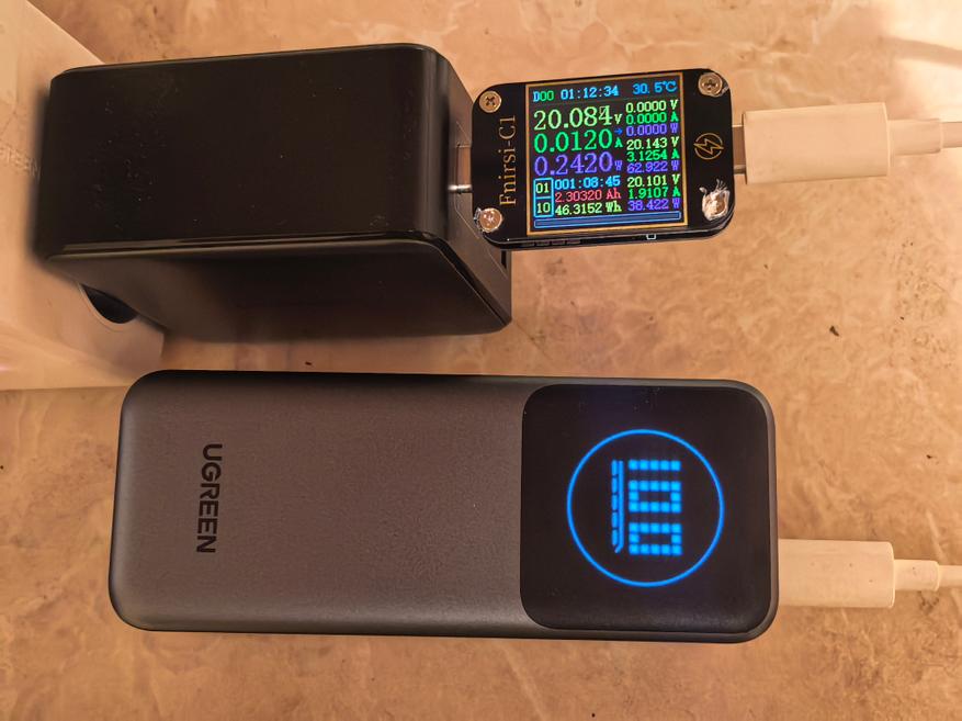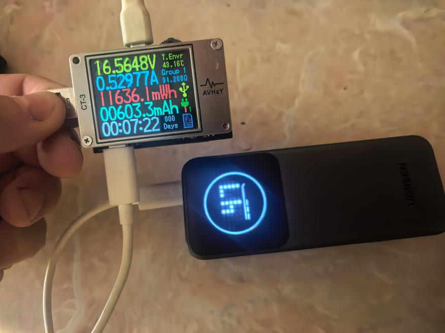 Проверять нагрев стал привычным для себя способом: подключил нагрузку AVHzY SM-LD-00 (обзор здесь) на 100Вт и стал ждать, что называется. Учитывая, что емкость у PB724 небольшая, решил снимать нагрев каждые пять минут. Много раз сделать этого не получилось. На 7 минуте напряжение начало скакать, в повербанке сработала защита от перегрева. Разрядился Ugreen к этому моменту на 54%,