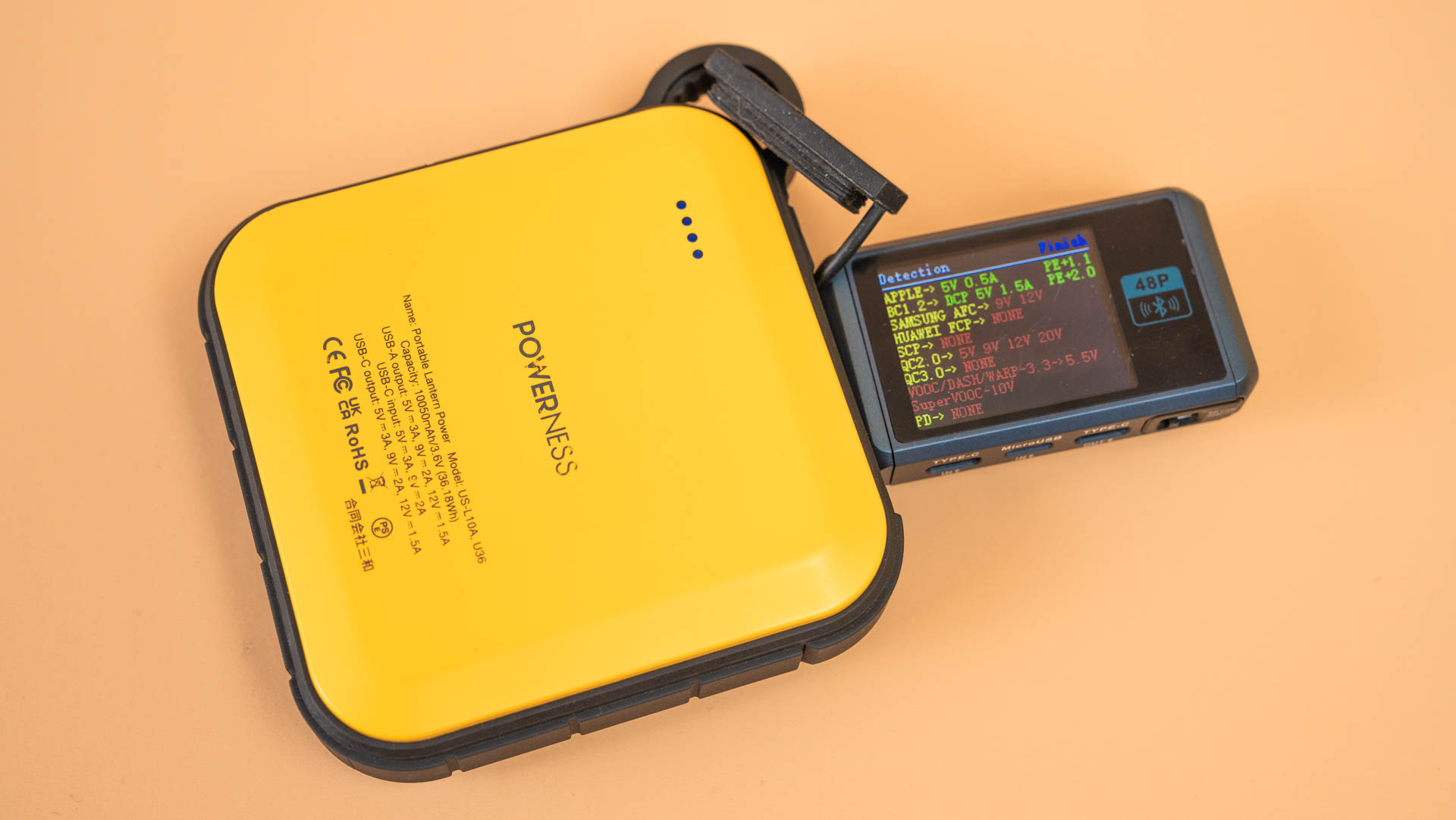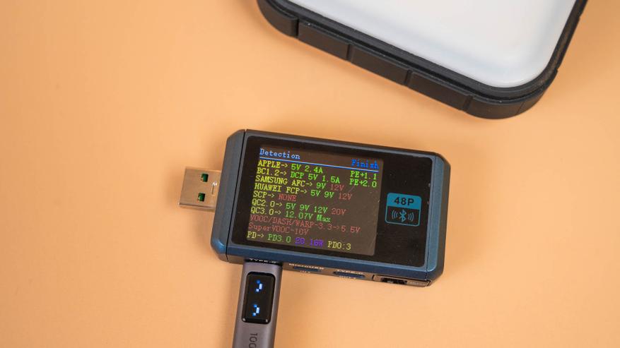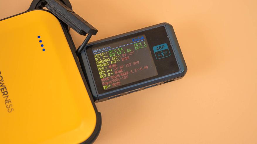 Пожалуй, самое интересное в любом повербанке — это то, насколько быстро он может зарядить гаджет. Я прогнал Powerness Hiker U36 через тестер и полез смотреть, какие протоколы он вообще понимает. Дальше — две подробные таблицы, но если коротко и без экранчиков: большинство популярных профилей устройство опознаёт без проблем. В режиме PD доступны три ступени: 5 В / 2,4 А (12 Вт), 9 В / 2,22 А (20 Вт) и 12 В / 1,68 А (20 Вт). Да, 20 ватт — не рекорд, но для поддержки телефона в тонусе и подзарядки пауэрбанка на привале хватит с запасом.