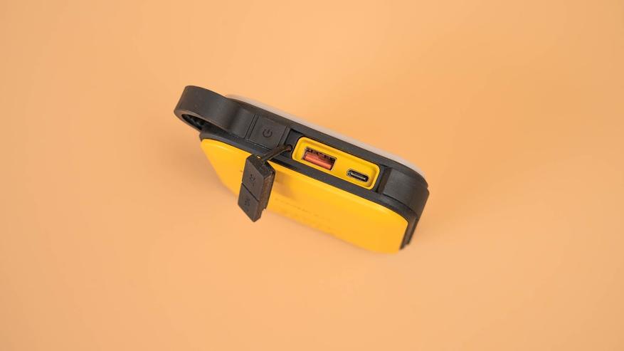 Всё самое интересное, как обычно, скрыто под резиновой заглушкой на торце. Она плотно прилегает, не люфтит — влага и пыль внутрь не попадут. За заглушкой расположены следующие порты: USB-C, через который можно зарядить сам повербанк и подключённые устройства, и USB-A, предназначенный только для зарядки внешних гаджетов.