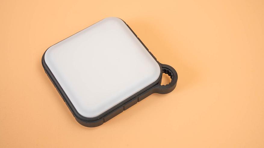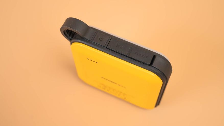 Корпус выполнен в форме квадрата с габаритами 97 x 97 x 28 мм и плавно закруглёнными углами, благодаря чему устройство удобно лежит в руке и не врезается в ладонь. Повербанк без труда помещается в карман куртки или брюк, а специальное ушко с карабином позволяет закрепить его на рюкзаке и забыть о его существовании.