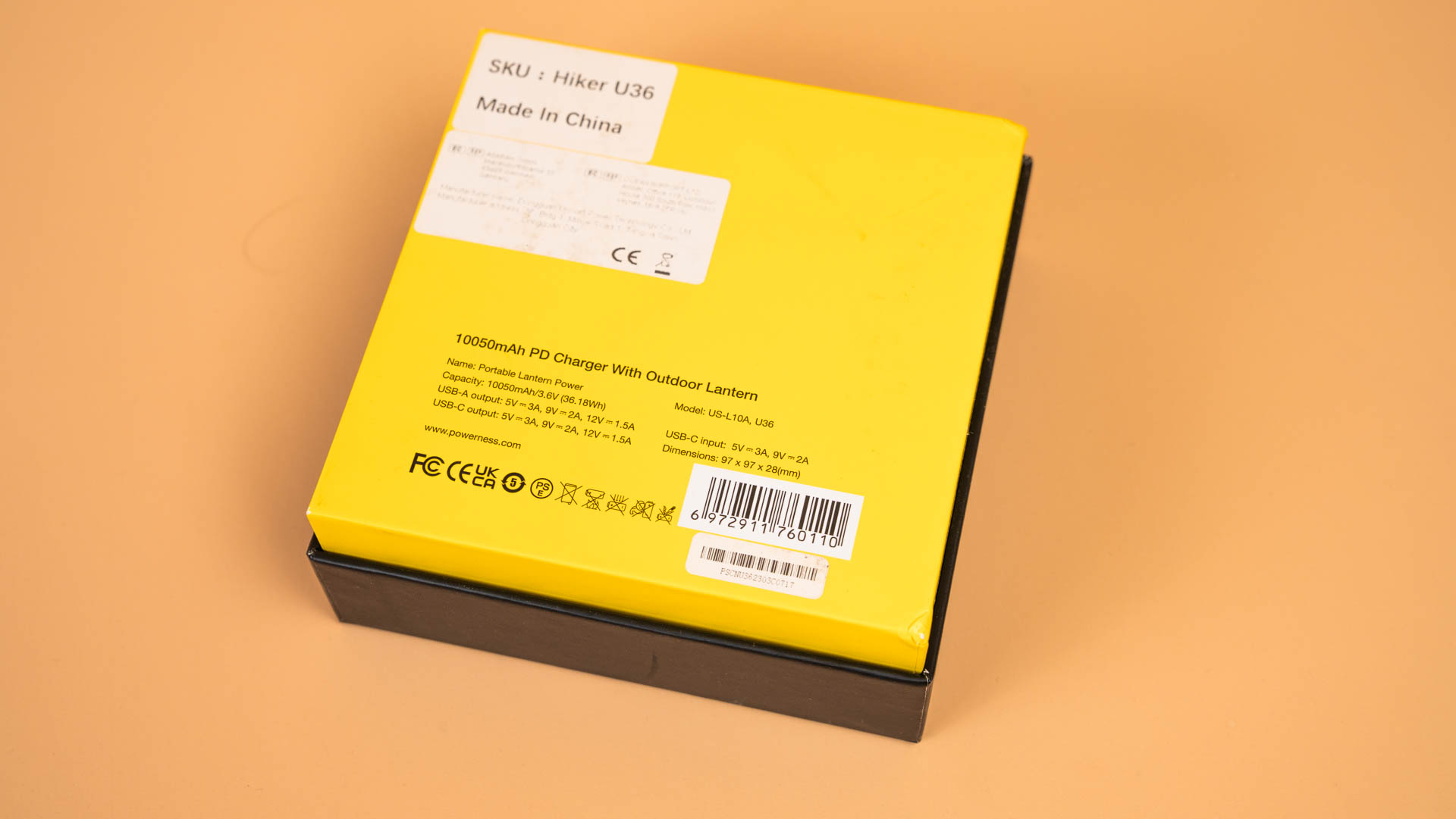 Powerness Hiker U36 поставляется в картонной коробке. Для защиты от повреждений во время транспортировки повербанк надежно закреплен внутри упаковки с помощью формованного поролонового вкладыша.