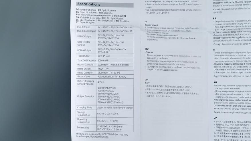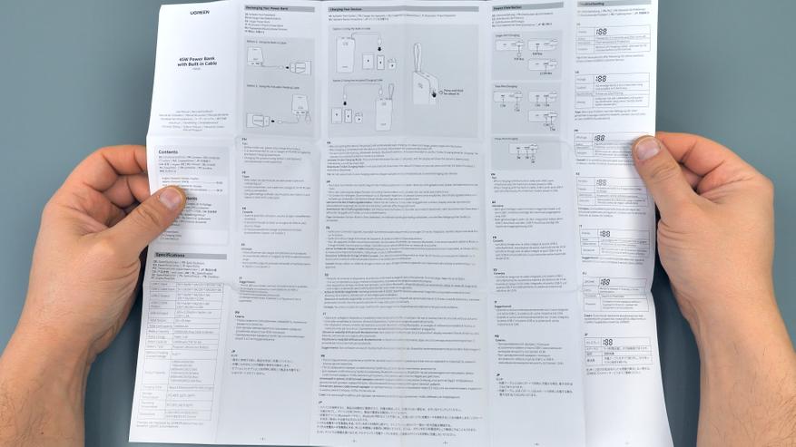 В комплекте с повербанком — инструкции на разных языках. В одной из них описаны варианты использования устройства, его возможности, приведена техническая информация, а также продублированы вольт‑амперные характеристики. Кроме того, в комплект входит небольшой кабель Type‑C, который можно использовать как для зарядки гаджетов, так и для зарядки самого повербанка.