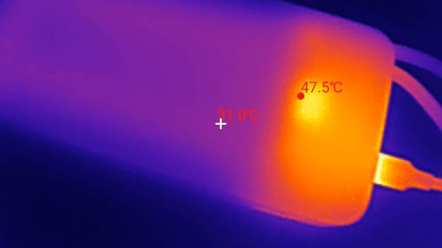 При зарядке самого повербанка перегрева не происходит: температура корпуса не превышает 48 °C, а процесс осуществляется на максимальной мощности 45 Вт — от 0 % до 100 %.