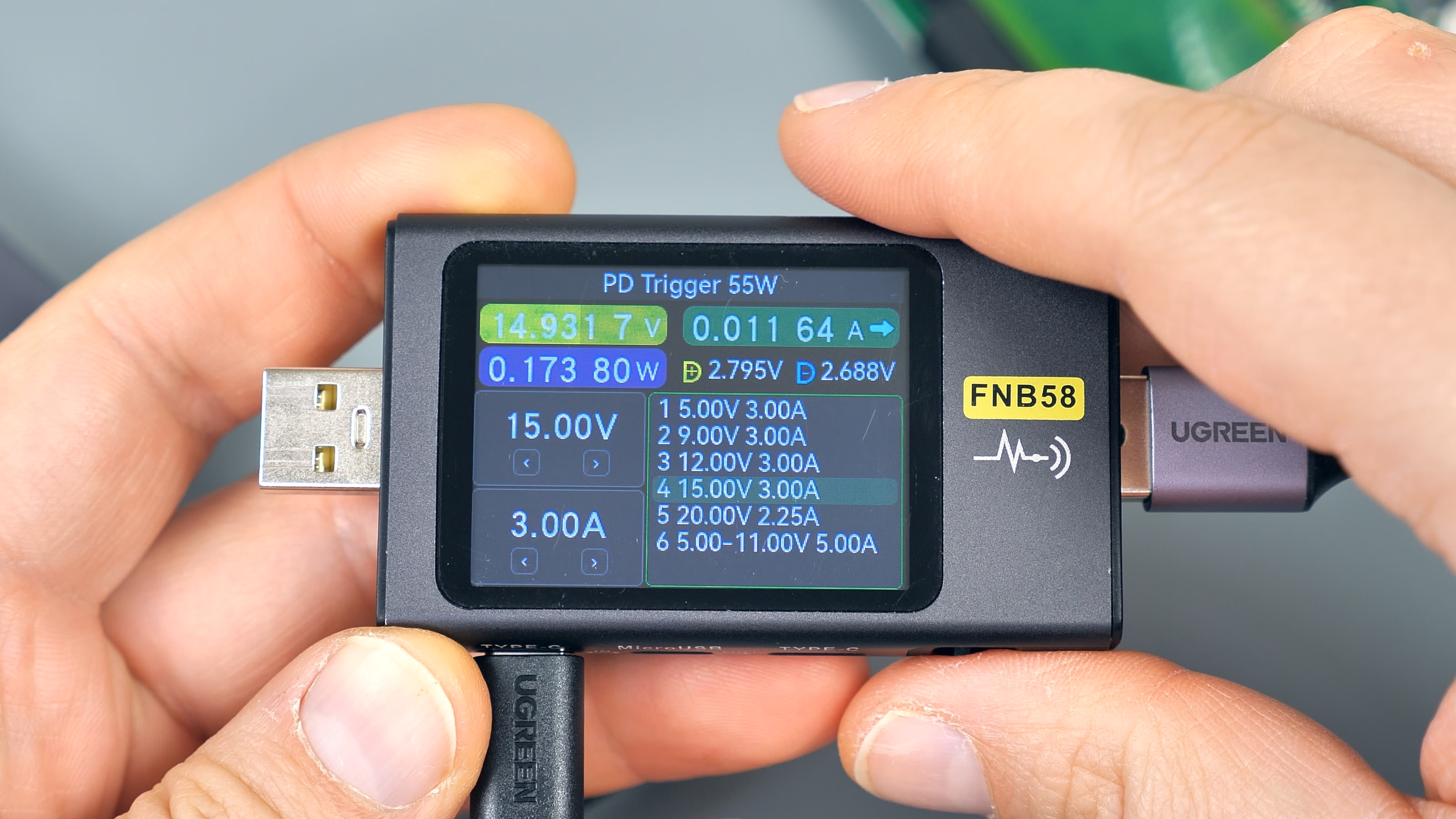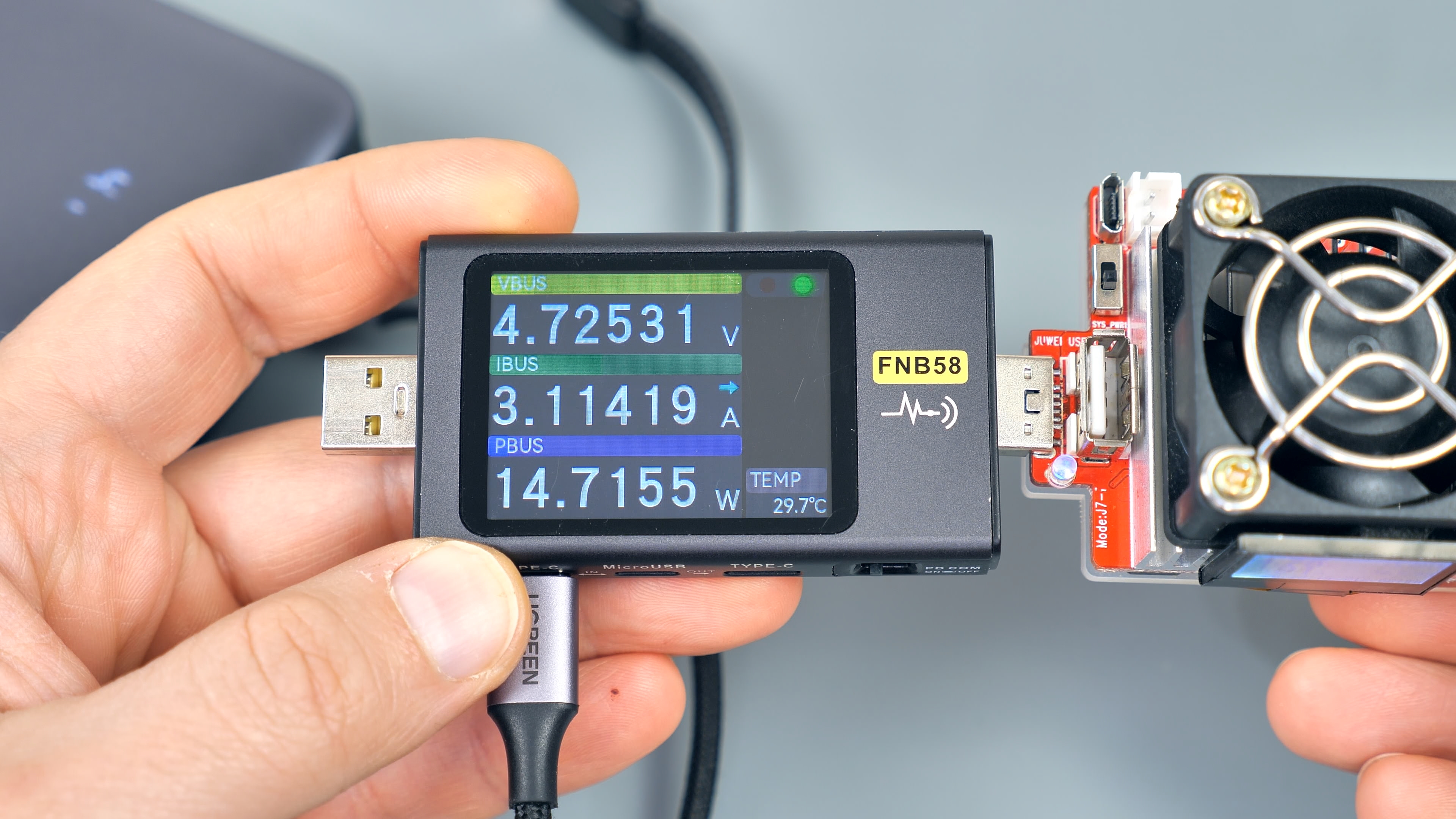 При подключении нагрузки и увеличении тока снять полные 15 Вт мощности не удалось: защита порта срабатывает при значениях около 14,8 Вт, что на 0,2 Вт ниже заявленного уровня. Причина заключается в используемом соединительном кабеле — на нём наблюдается незначительное падение напряжения, что является естественным явлением. При этом порт действительно выдаёт ровно 15 Вт и не более. Ток составляет 3 А, и это подтверждается показаниями тестера. Однако из‑за небольшого снижения напряжения на кабеле на тестере не удаётся зафиксировать ровно 15 Вт. Порт обеспечивает заявленную мощность в 15 Вт, но запас по мощности отсутствует.
