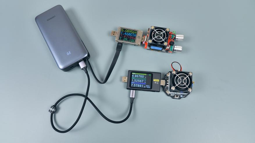 Причина полной идентичности характеристик заключается в том, что повербанк оснащён единым общим контроллером. Это подтверждается поведением портов при переключении нагрузки: при каждом подключении или отключении нагрузки второй порт Type‑C перезагружается. Аналогичная ситуация наблюдается и с портом USB A. Взаимодействие с любым из портов приводит к перезагрузке остальных.