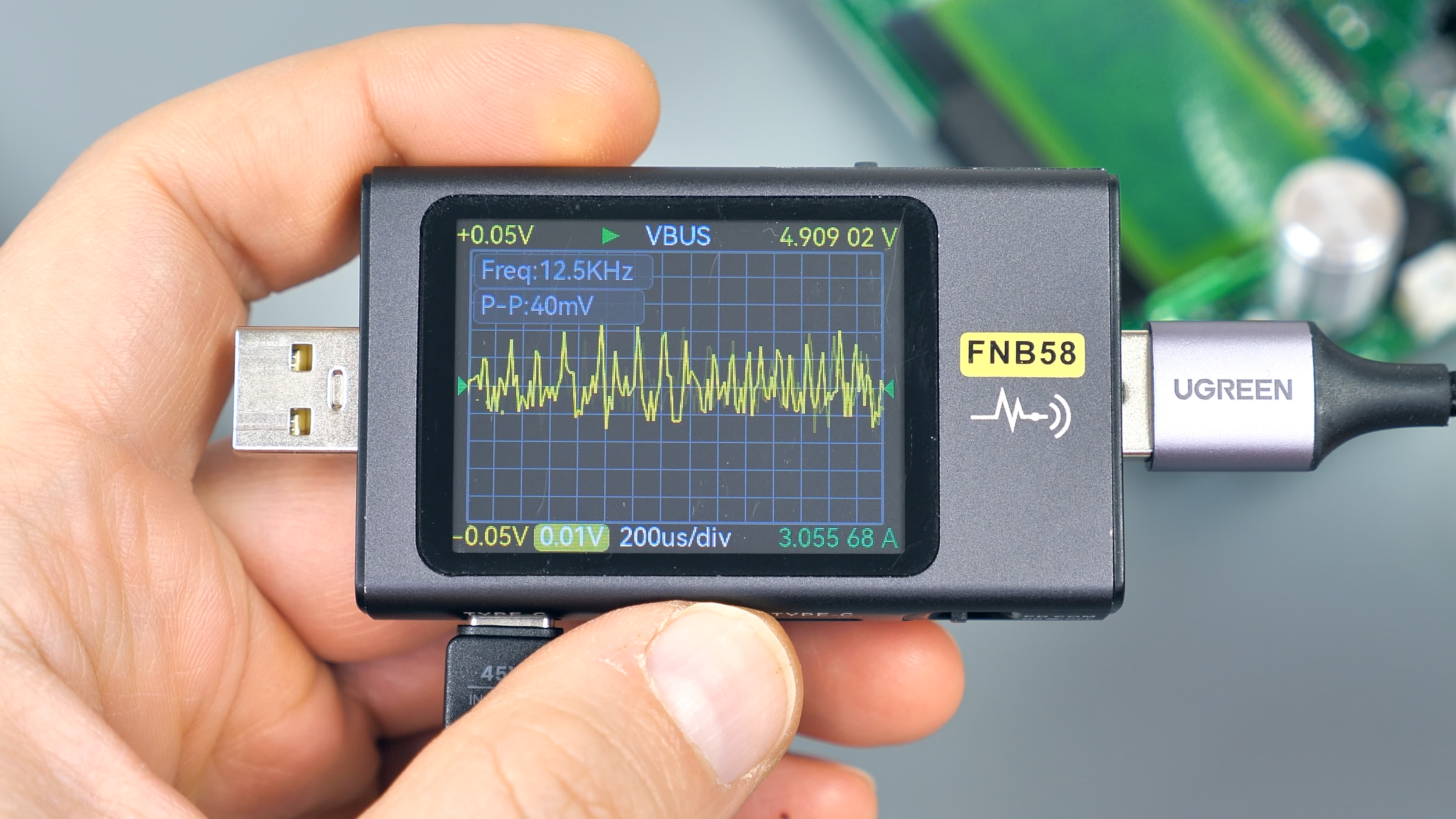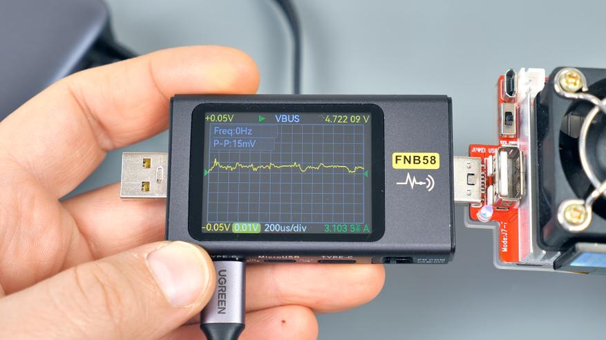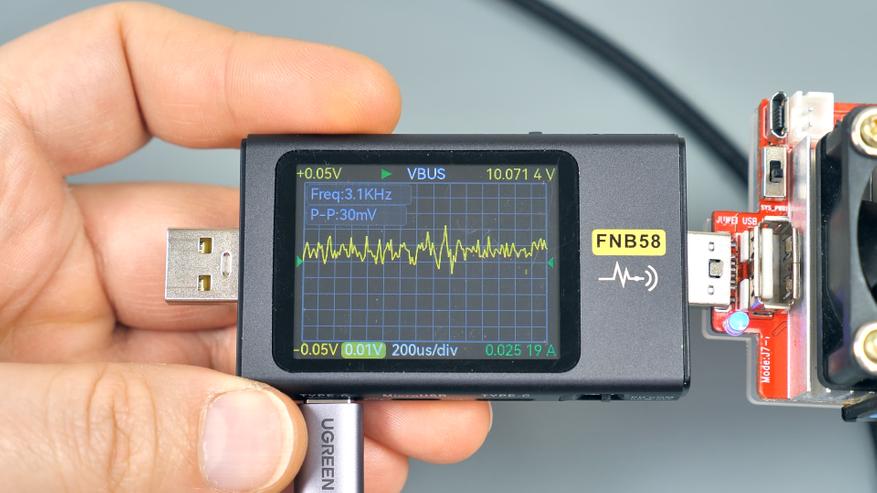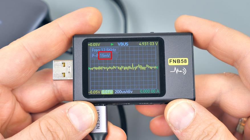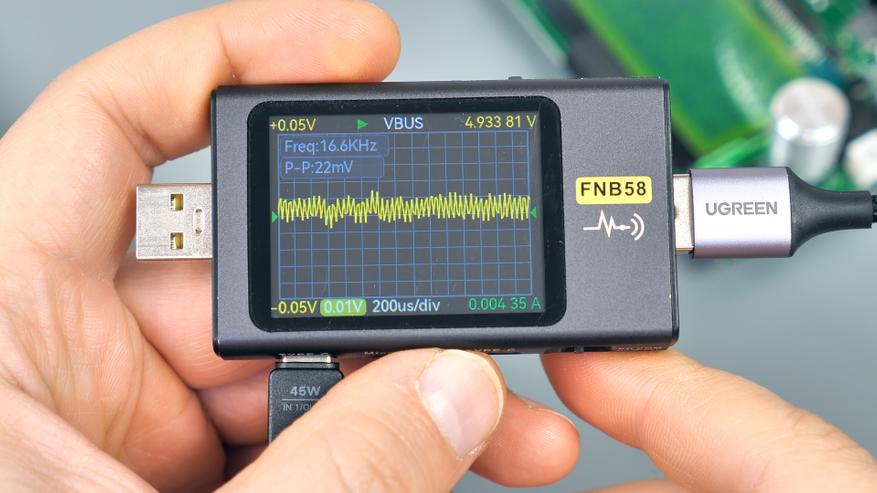 Далее — тест встроенного Type‑C‑кабеля. При стандартном напряжении 5 В и отсутствии нагрузки уровень пульсаций на нем составляет около 22 мВ. В процентном отношении это всего 0,44 % от напряжения, что значительно ниже предельно допустимых значений.