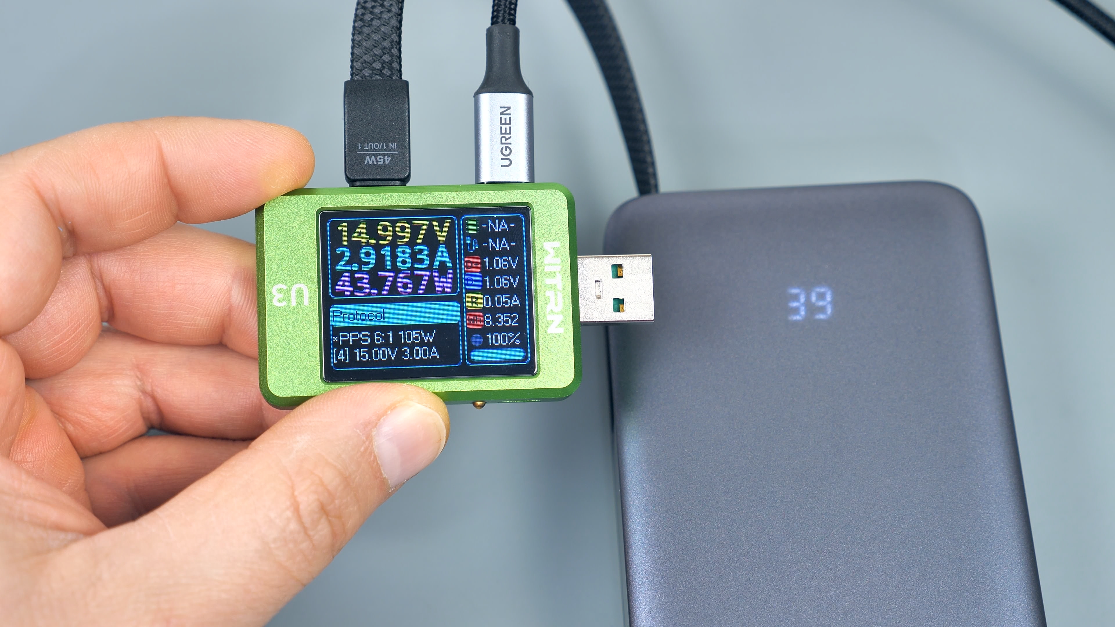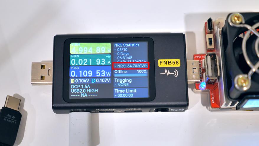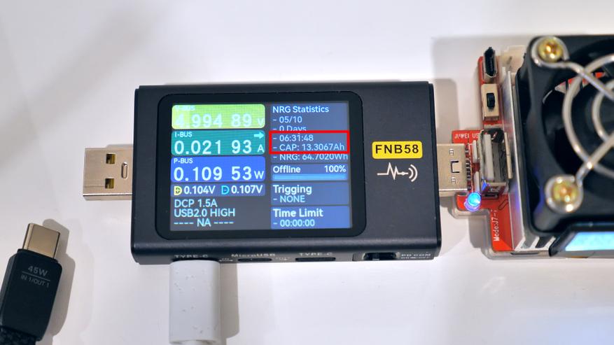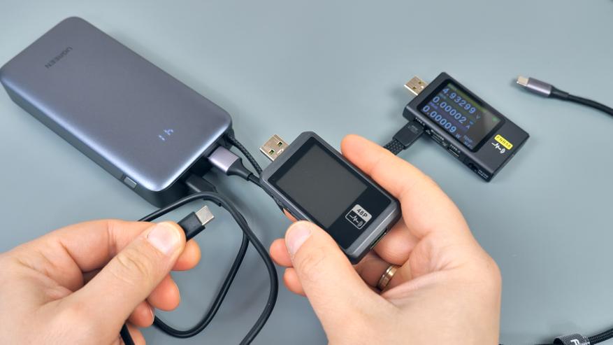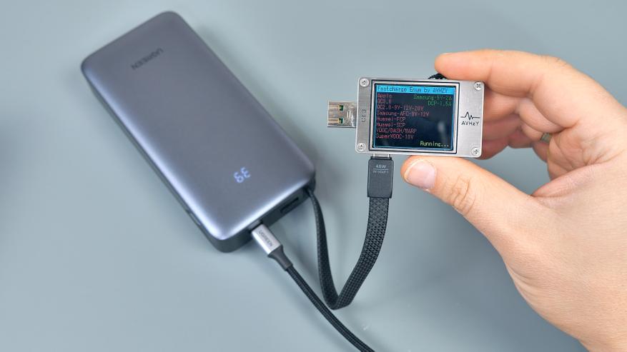 Зарядка повербанка возможна через любой порт Type‑C; при этом входная мощность может достигать 45 Вт, что обеспечивает быструю зарядку — при условии использования соответсвующего зарядного устройства. Повербанк поддерживает те же протоколы зарядки, что и для питания подключённых гаджетов. В ходе тестирования при подключении к 100‑Вт GaN‑зарядному устройству повербанк заряжался с использованием протокола Power Delivery в режиме PPS током 3А при напряжении 15 В.