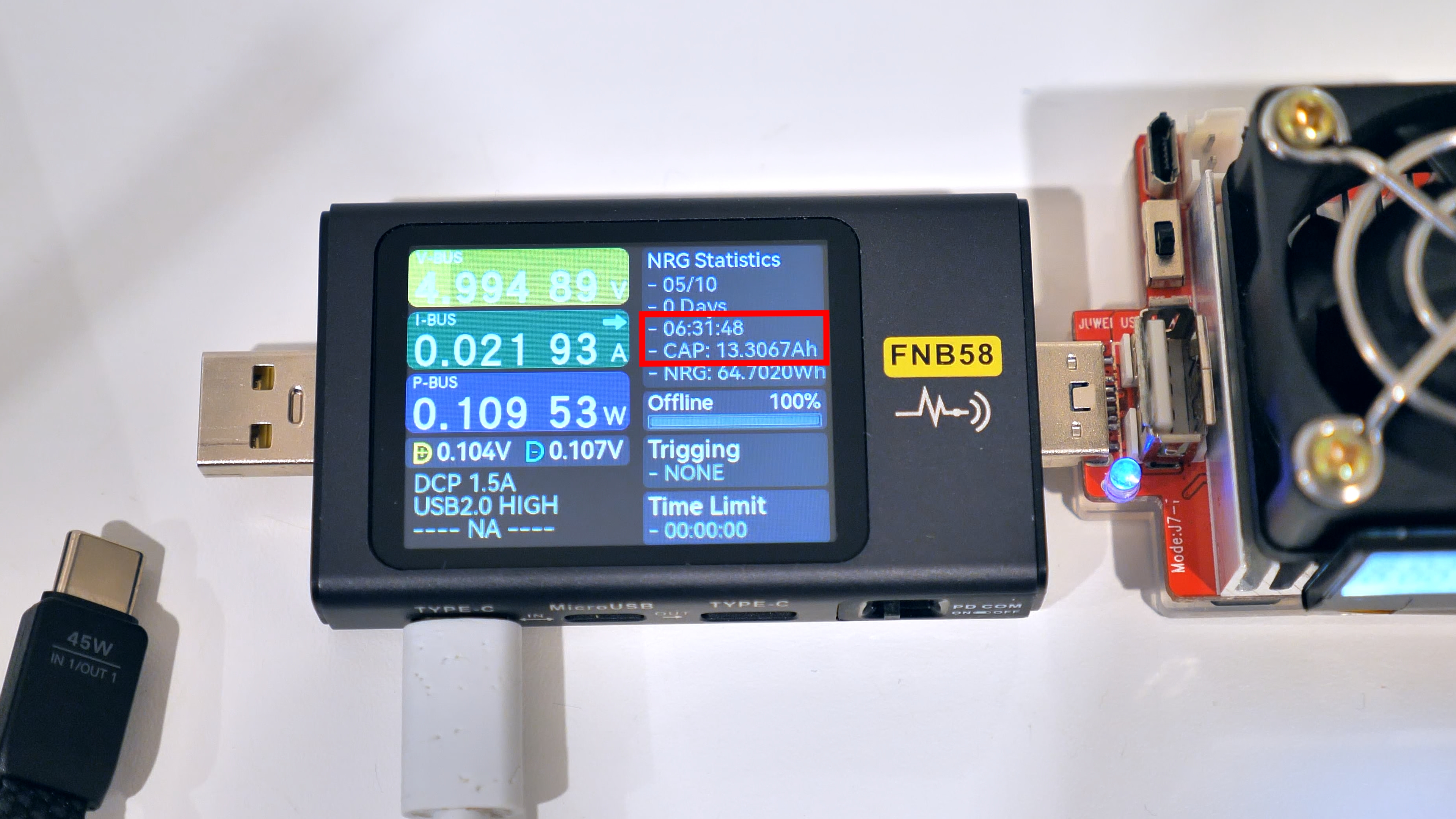 Для проверки реальной ёмкости аккумулятора повербанка он был разряжен со 100 % до 0 % при мощности 10 Вт, током 2 А при напряжении 5 В. Такой режим выбран намеренно: он позволяет минимизировать нагрев преобразователя и снизить потери энергии на тепловыделение, исключая влияние перегрева и иных побочных факторов на точность измерений.