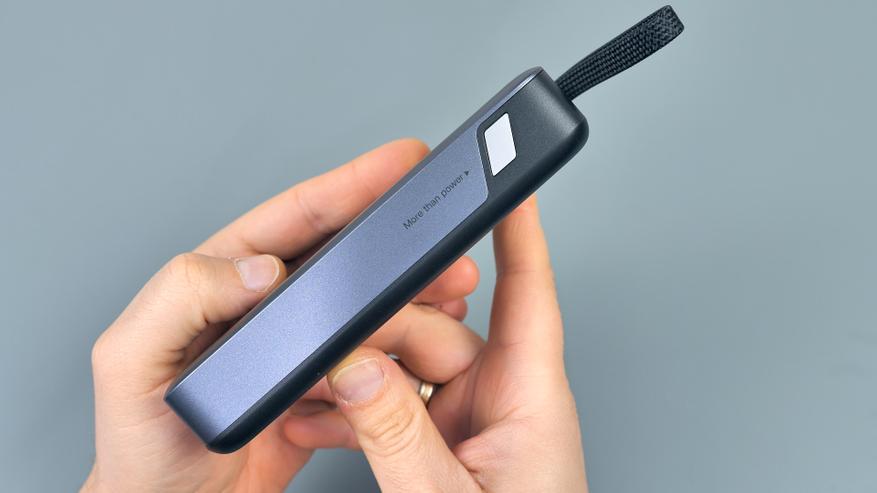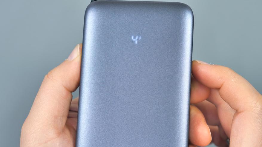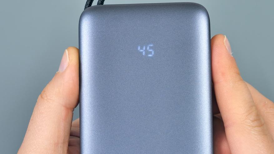 Соответствует ли повербанк заявленным характеристикам? Да, вполне. Ёмкость аккумулятора реальна: её достаточно для двух полных зарядок современных смартфонов. Мощность в 45 Вт покрывает потребности большинства бытовых сценариев — с некоторым запасом. При этом повербанк способен как отдавать мощность до 45 Вт, так и принимать её во время собственной зарядки, что обеспечивает достаточно быструю подзарядку устройства. Кроме того, имеется функция сквозной зарядки, которая присутствует не у всех аналогов. Устройство оснащено тремя портами, причём один из них снабжён встроенным кабелем, выполняющим также функцию ручки для переноски. Дополнительно реализованы режим зарядки слаботочных устройств и светодиодный индикатор состояния. В комплект входит ещё один кабель, что тоже можно считать плюсом.