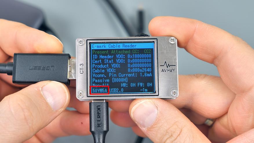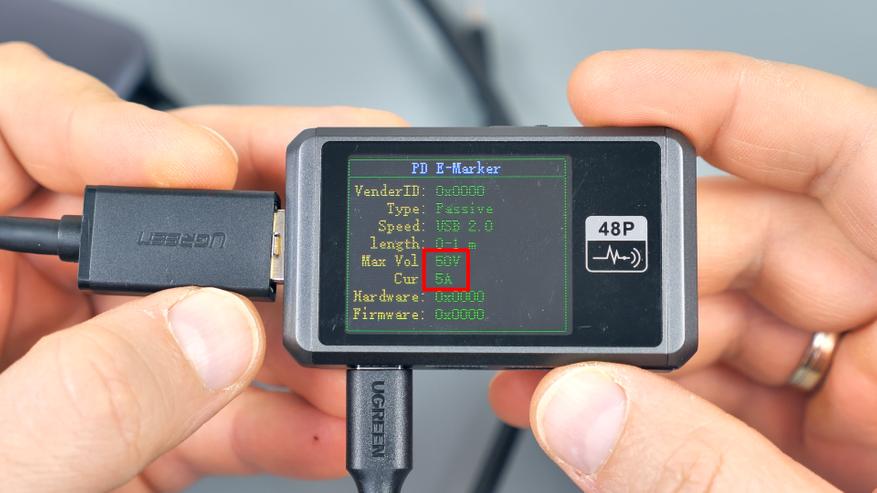 Для сканирования Type‑C‑порта повербанка потребовался соответствующий кабель — например, из комплекта поставки. Однако прежде было решено проверить наличие e‑маркера. Каково же было удивление, когда тестер показал его присутствие — причём с поддержкой мощности до 250 Вт (5 А при 50 В). Эти данные подтвердил и другой тестер: кабель действительно рассчитан на столь высокую мощность. Возникает вопрос: зачем производитель комплектует относительно маломощный (45 Вт) повербанк столь производительным кабелем? Ответа нет, но факт приятный. Для данного устройства вполне хватило бы кабеля без e‑маркера со стандартной поддержкой 60 Вт. Тем не менее имеющийся кабель обладает поддержкой высокой мощности — и это несомненный плюс.