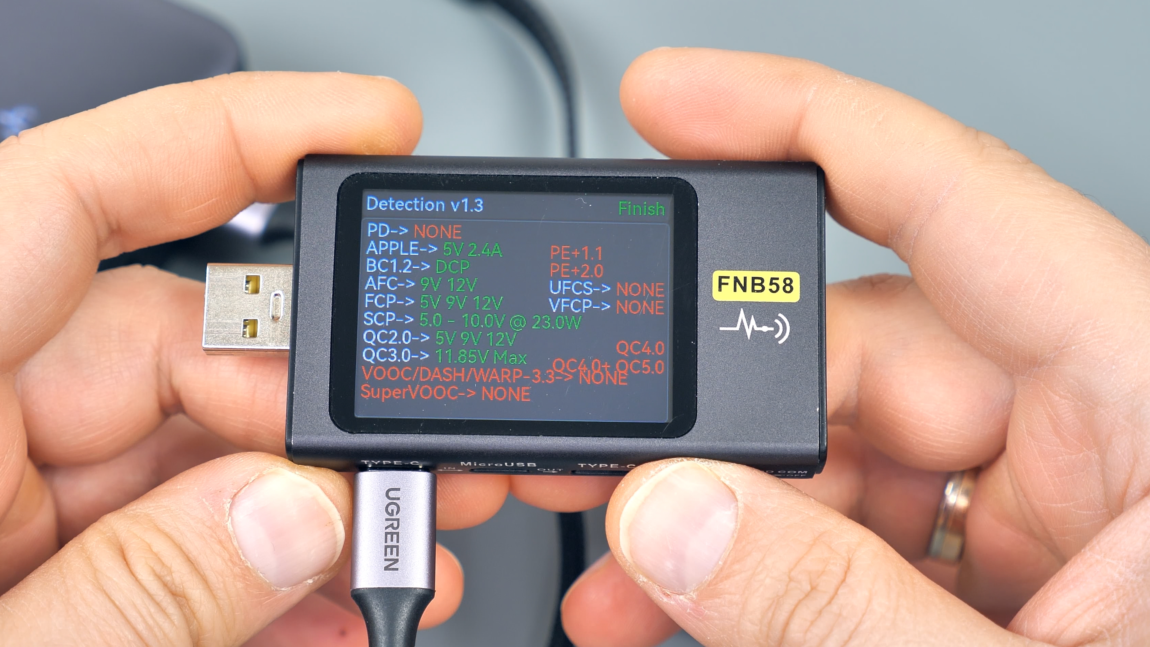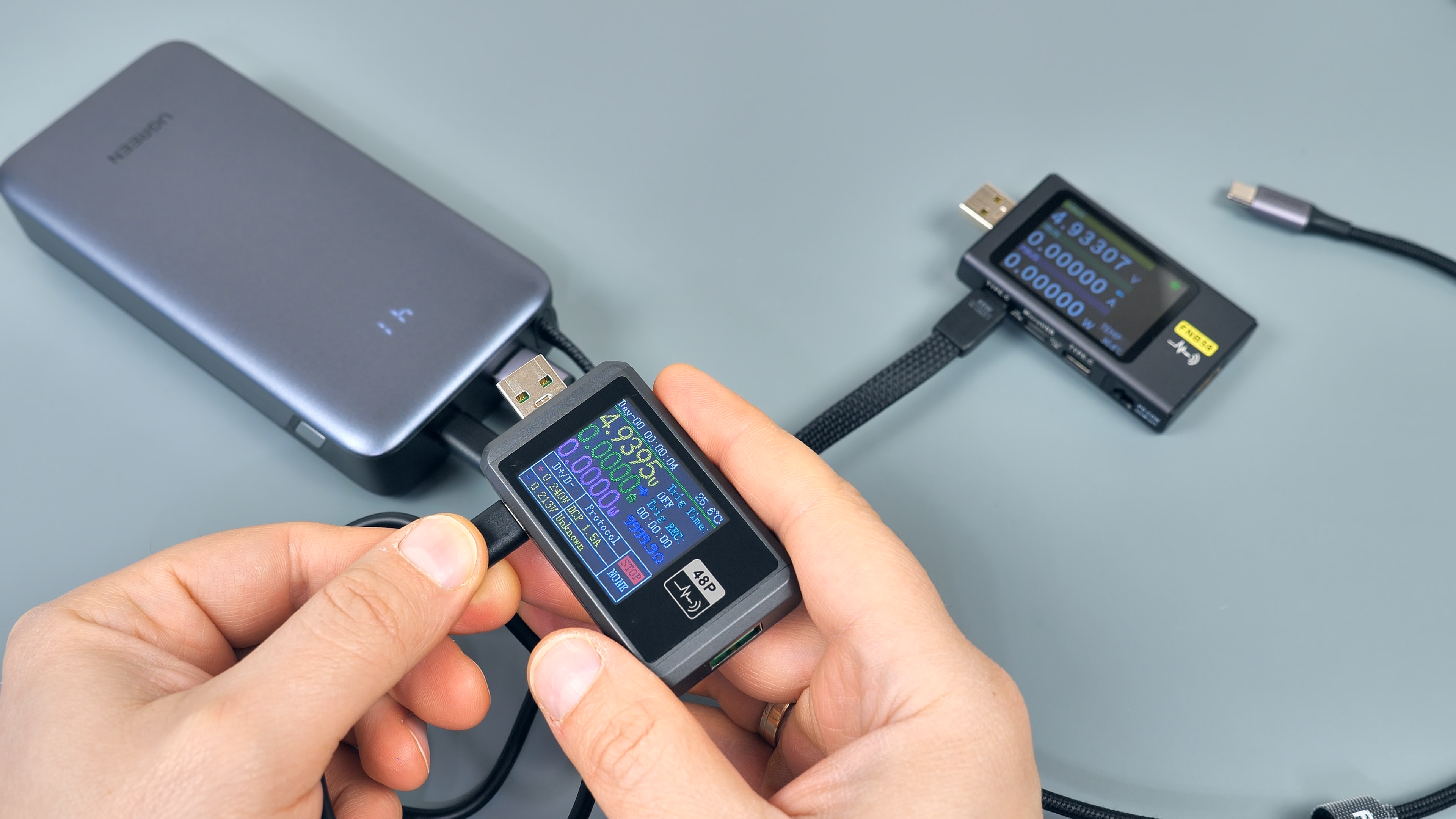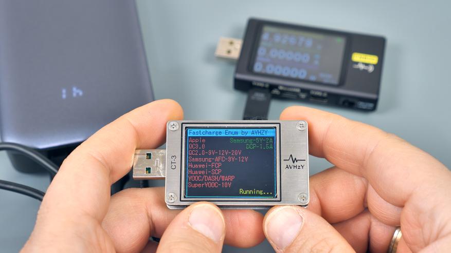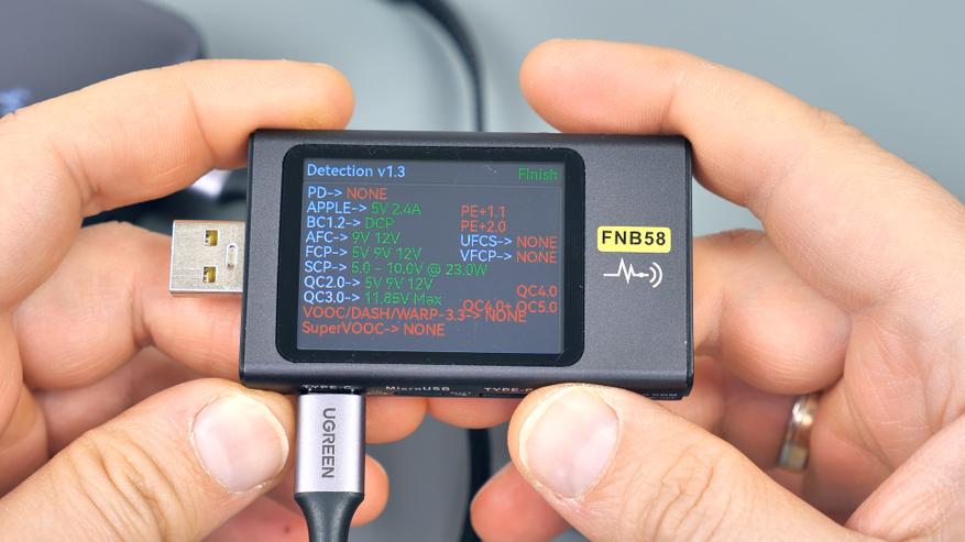 Сканирование Type‑C‑порта на наличие протоколов быстрой зарядки показало, что он поддерживает те же протоколы и вольт‑амперные характеристики, что и встроенный кабель. Это означает: оба Type‑C‑интерфейса полностью идентичны, и нет разницы, через какой из них заряжать гаджеты.