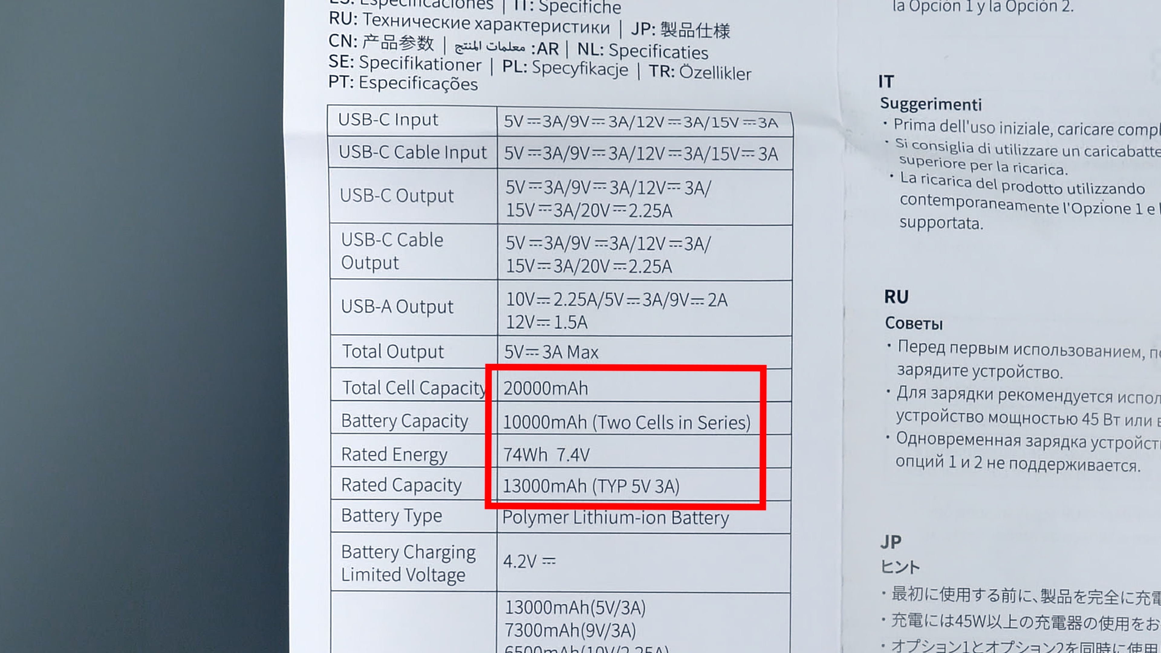 | Номинальная ёмкость | 13 000 мАч (TYP 5V3A) |