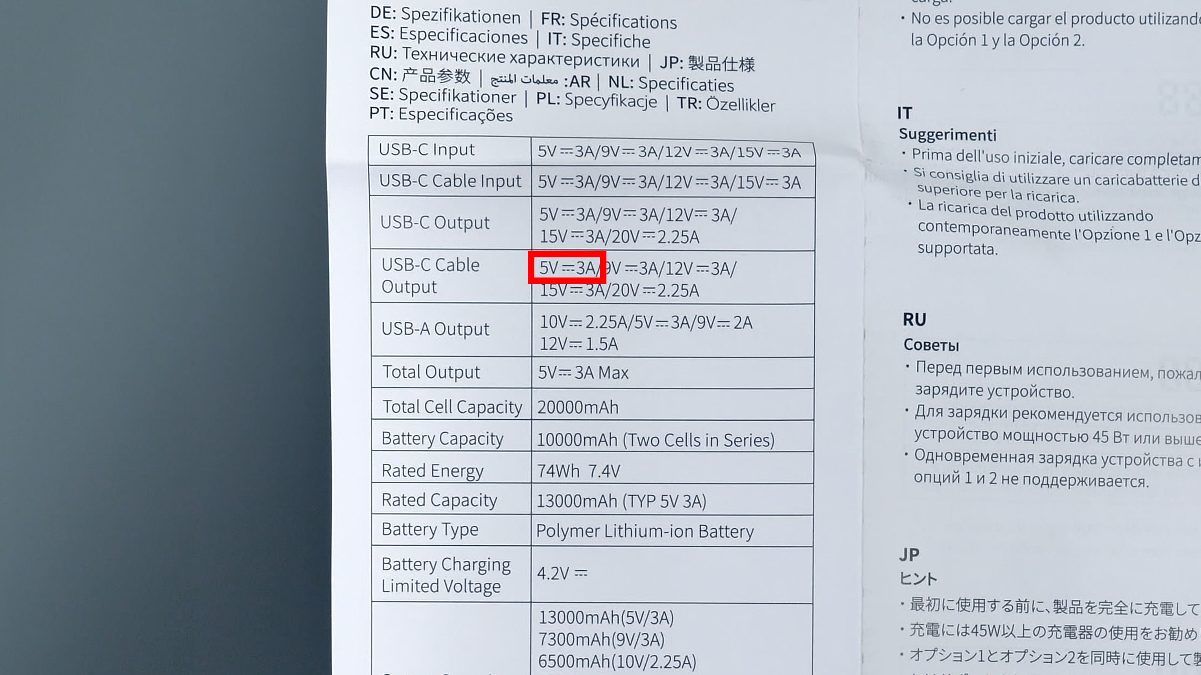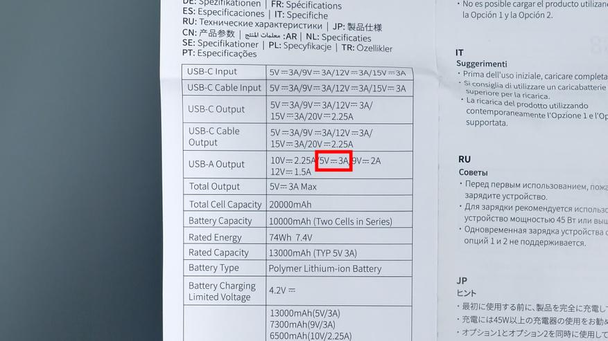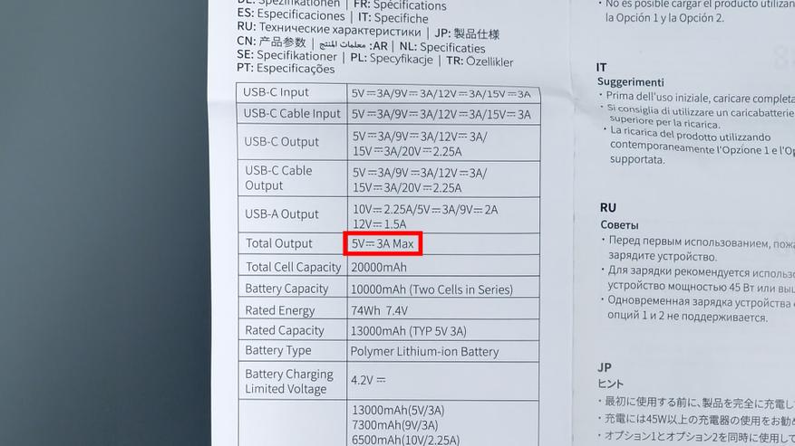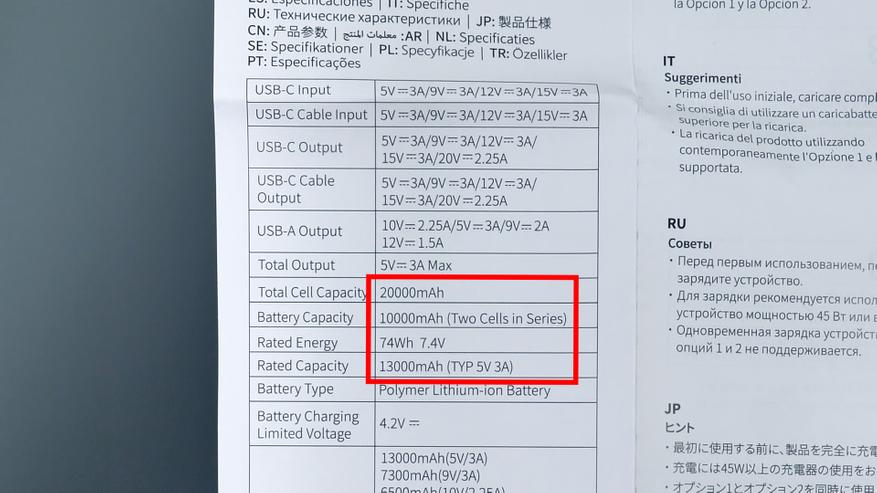 Производитель заявляет ёмкость аккумулятора 20 000 мА·ч. Однако это значение соответствует номинальному напряжению аккумулятора — 3,7 В. При других напряжениях, в частности при 5 В, указанная ёмкость изменяется. Производитель честно приводит и этот показатель — 13 000 мА·ч, что в целом совпадает с результатами теста (13 300 мА·ч). Для корректного сравнения энергоёмкости устройств следует ориентироваться не на ампер‑часы, а на показатель энергетической ёмкости в ватт‑часах. В данном случае производитель указывает значение 74 Вт·ч. Этот параметр остаётся неизменным независимо от используемого напряжения и служит более точным индикатором общей энергоёмкости устройства.