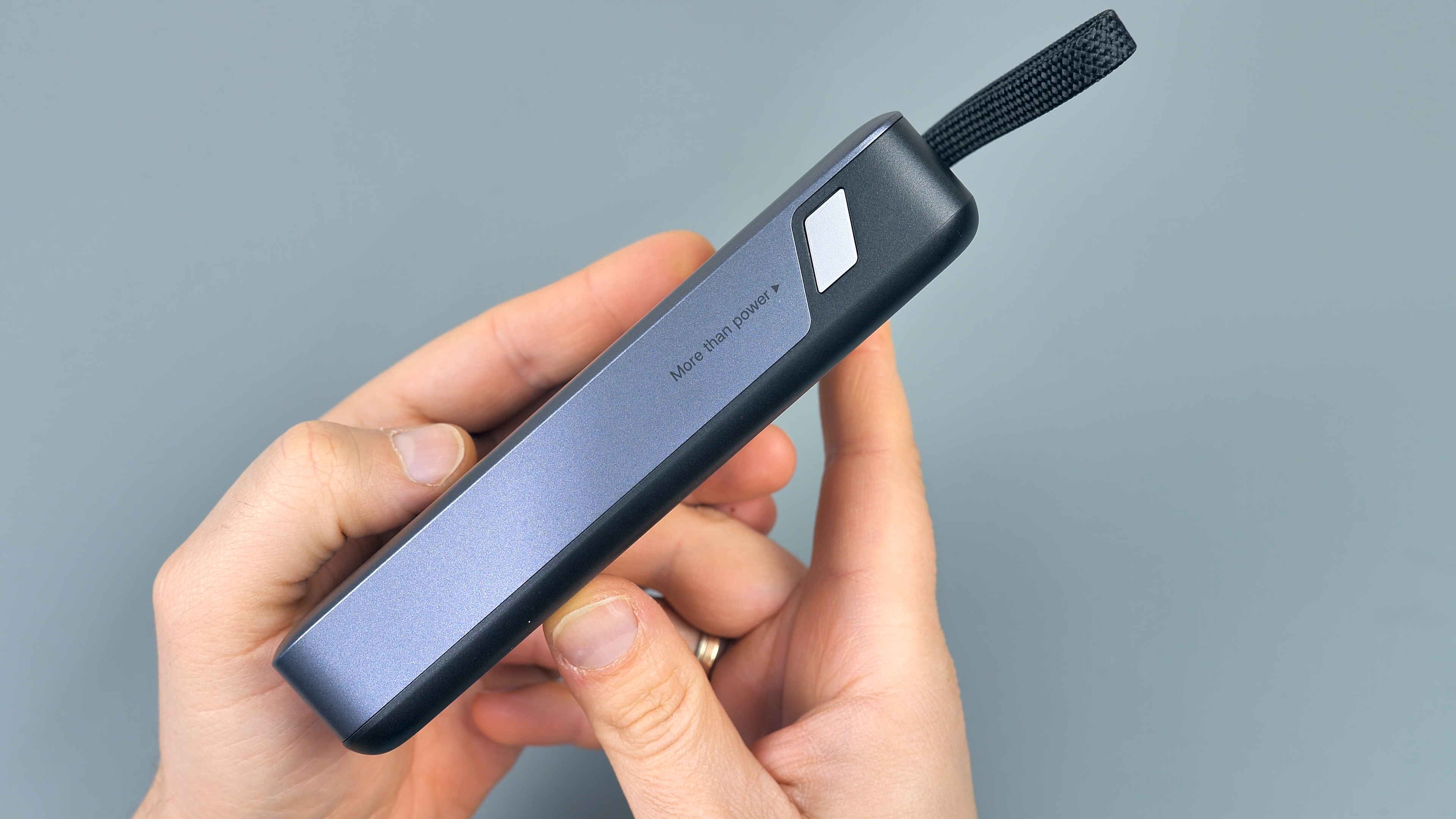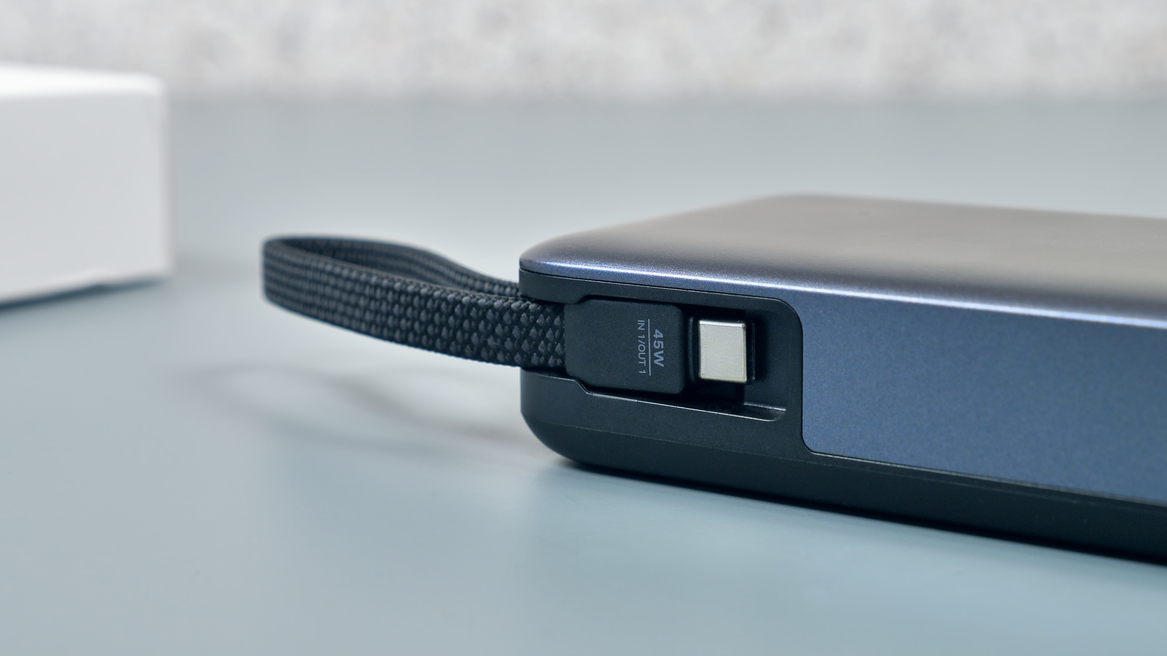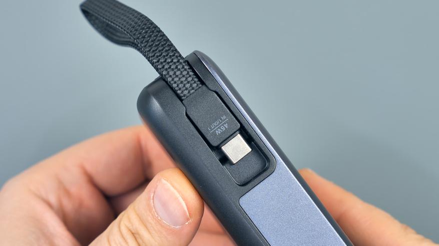 На противоположной от кнопки стороне расположено место крепления встроенного кабеля Type‑C. Кабель легко извлекается и устанавливается, при этом надёжно фиксируется — это исключает его самопроизвольное выпадение. Благодаря прочной оплётке и надёжной фиксации кабель можно использовать как ручку‑переноску: нет риска, что он порвётся или отсоединится.