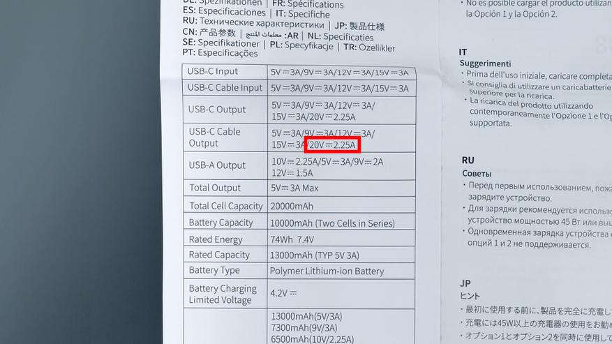 | Емкость аккумулятора | 20 000 мАч (38,5 Вт·ч) |