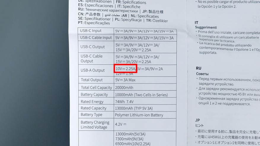 Максимально выдаваемая портом мощность заявлена как 22,5 Вт — то есть до 2,25 А при напряжении 10 В.