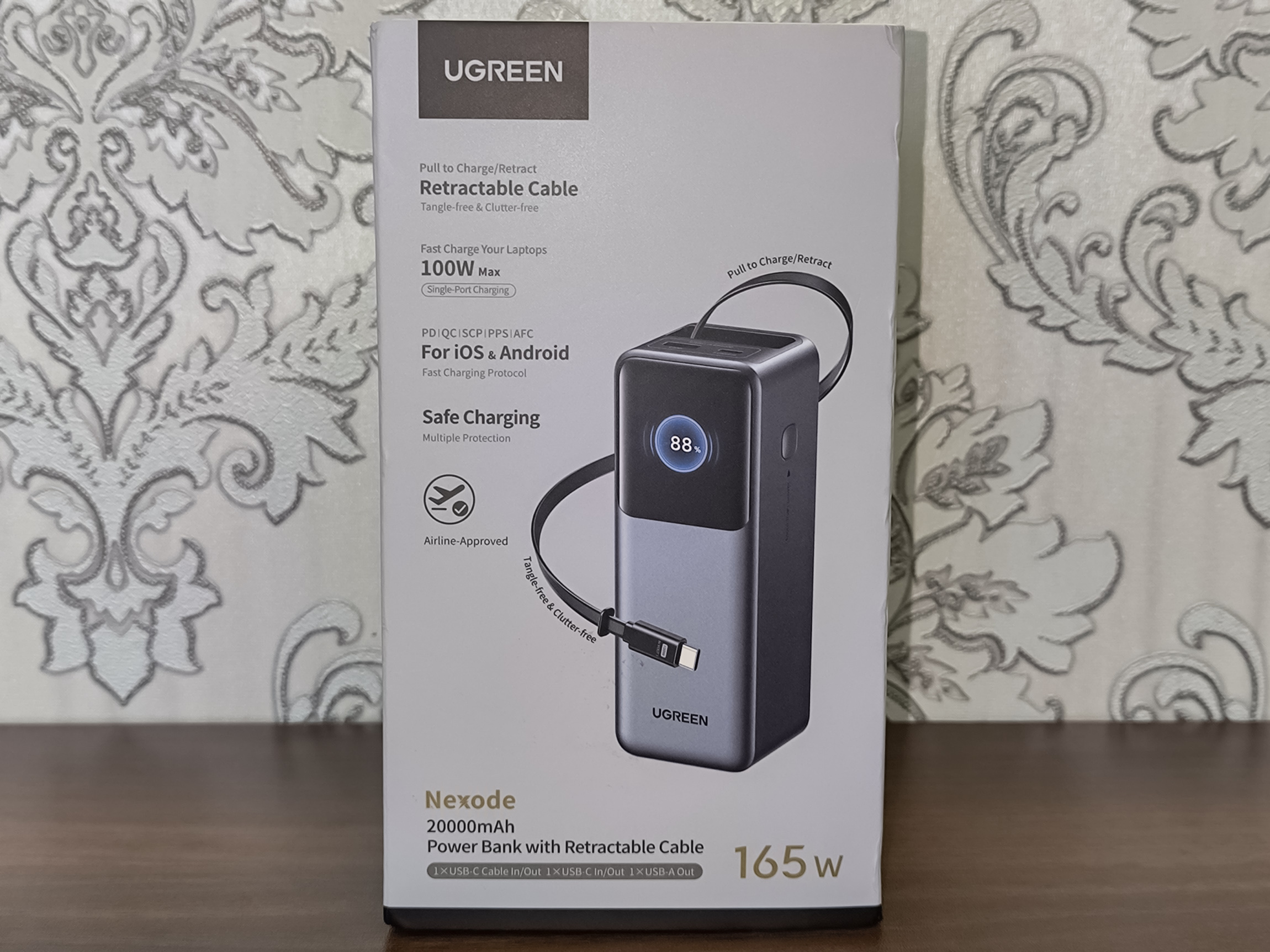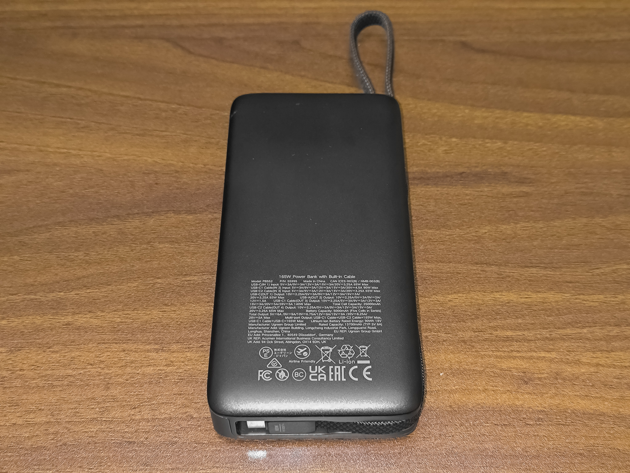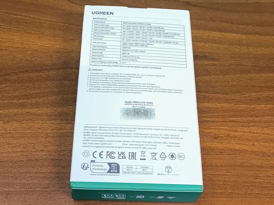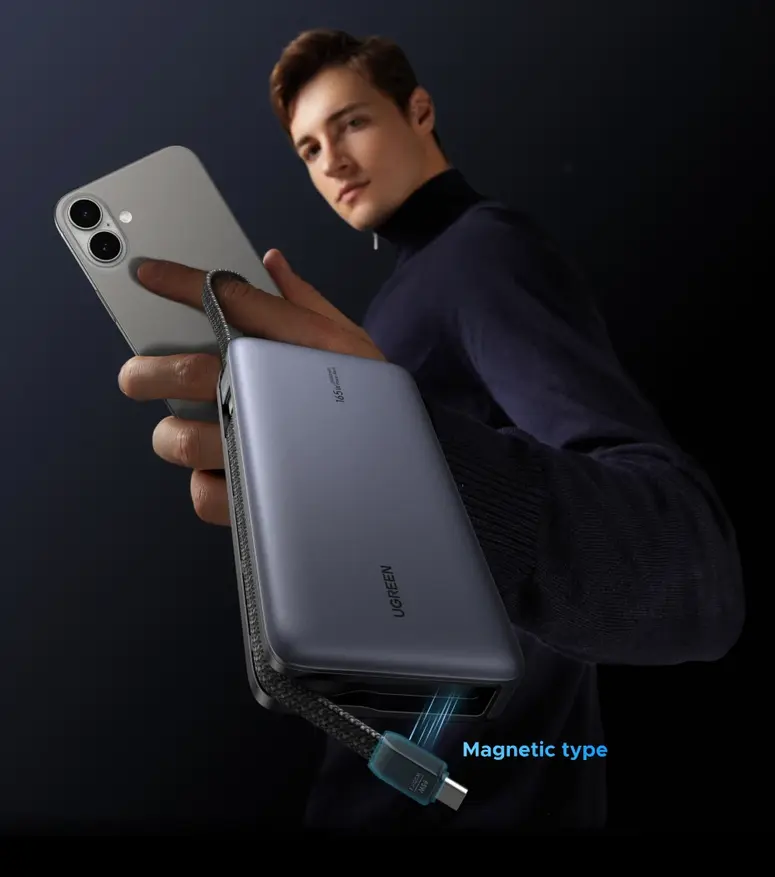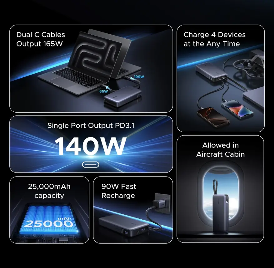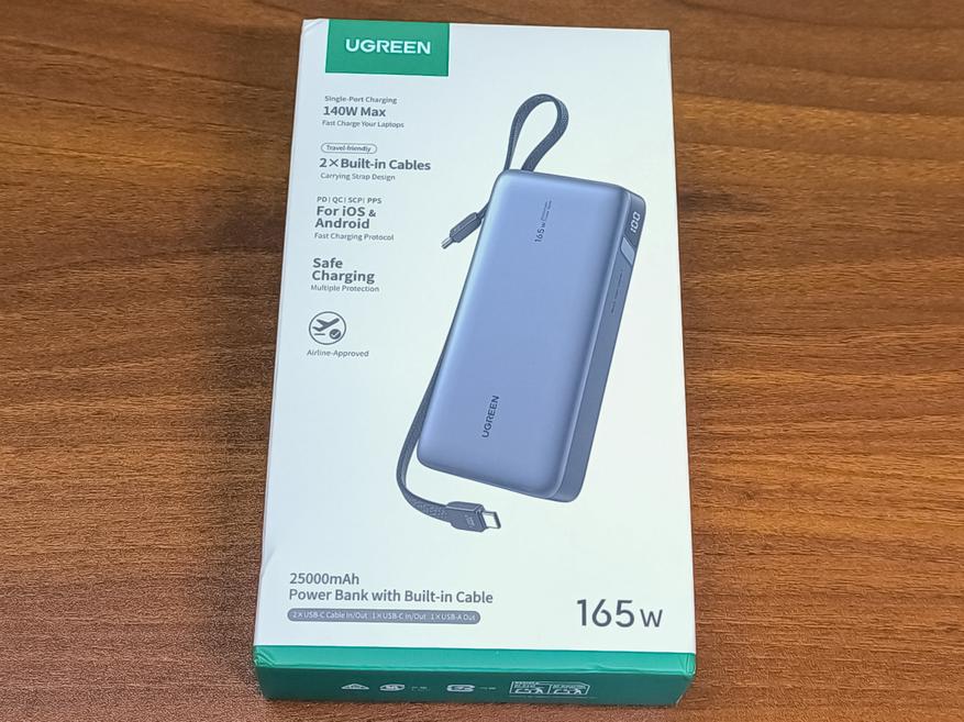 Ugreen PB552 — это внешний аккумулятор с общей максимальной мощностью 165W, поддержкой Power Delivery 3.1 и ёмкостью 25000mAh, который оснащен сразу двумя встроенными кабелями USB-C, а так же двумя дополнительными портами.