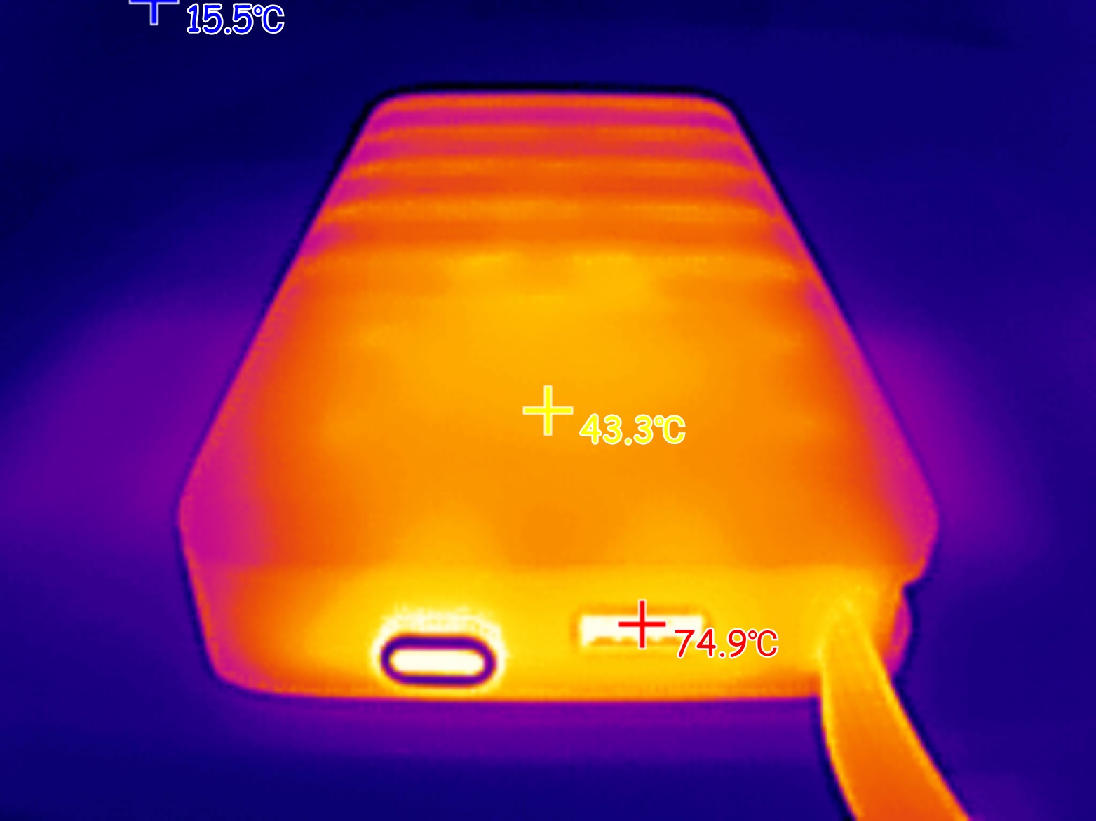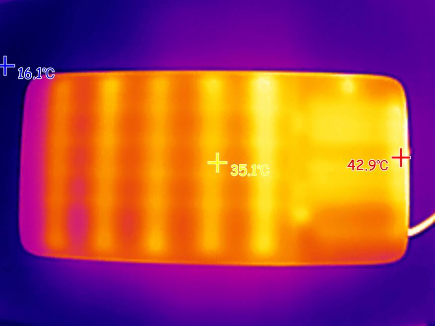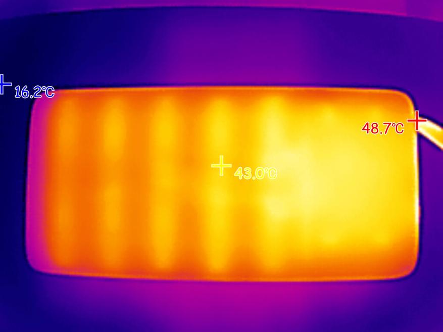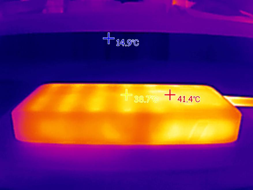 Ниже с помощью тепловизора зафиксировал максимальную температура внешнего аккумулятора во время зарядки ноутбука мощностью 100W.