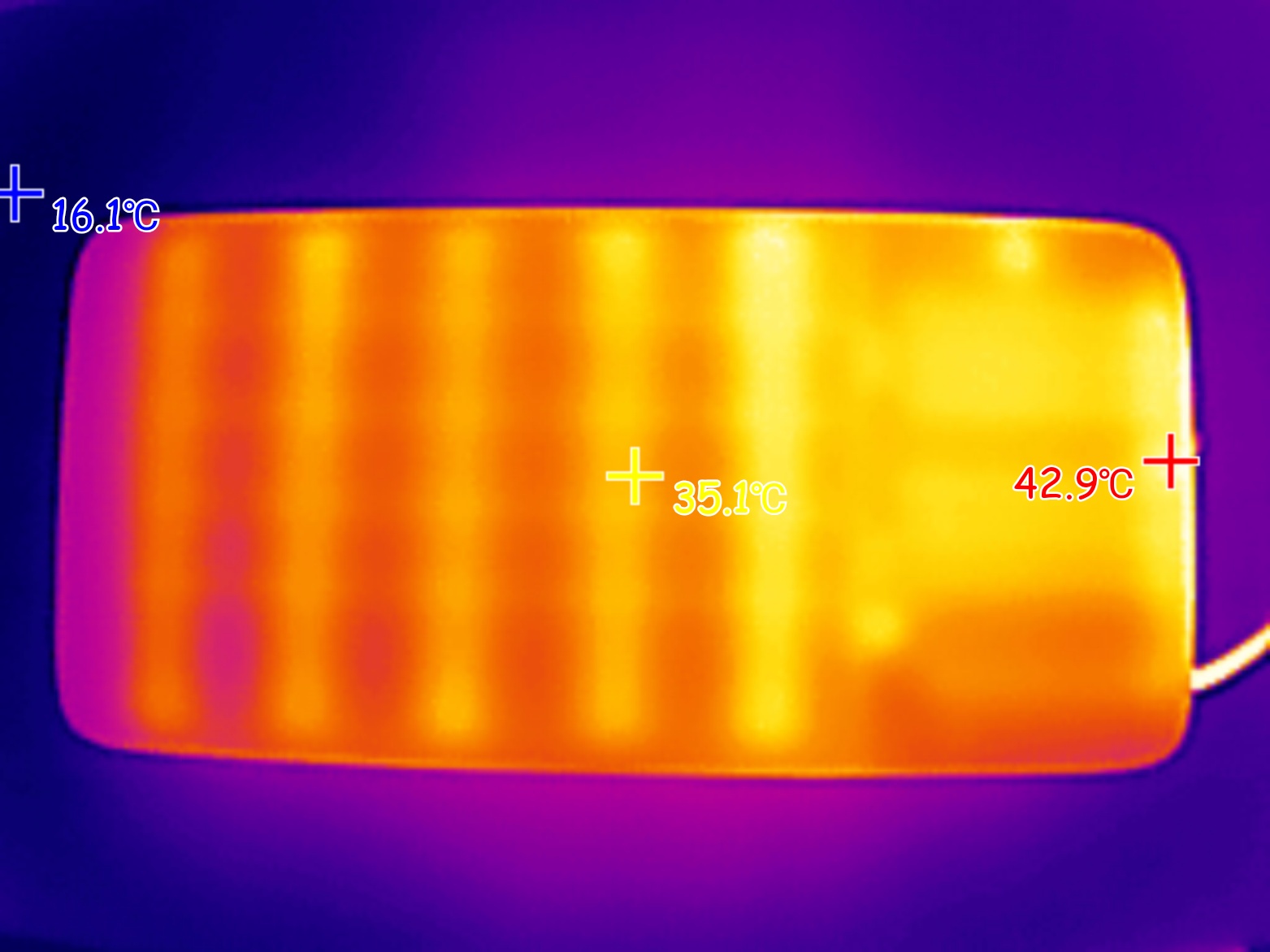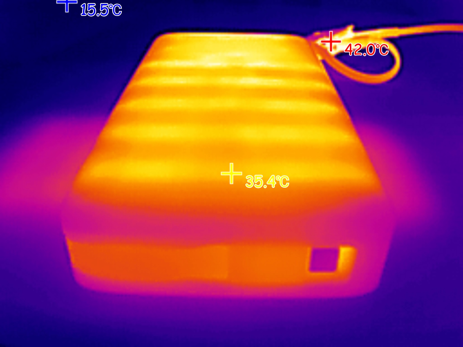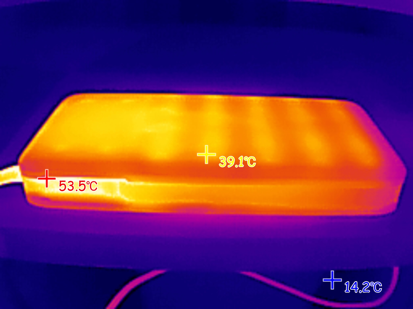 Ниже с помощью тепловизора зафиксировал максимальную температура внешнего аккумулятора во время зарядки ноутбука мощностью 100W.