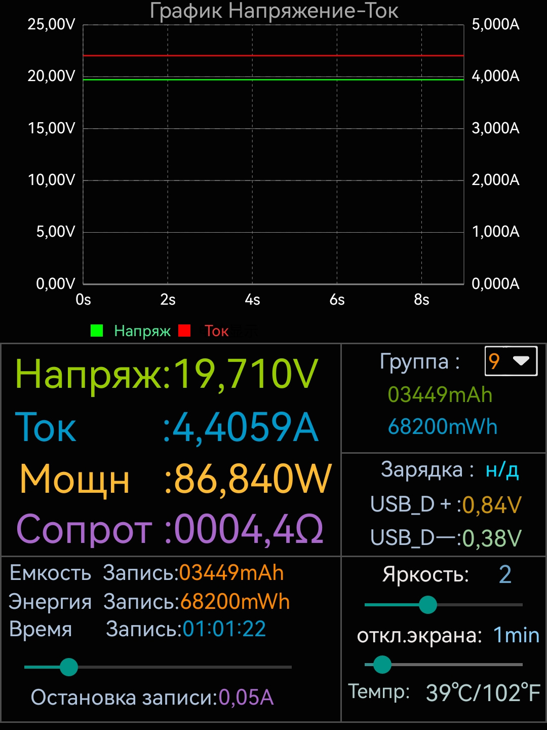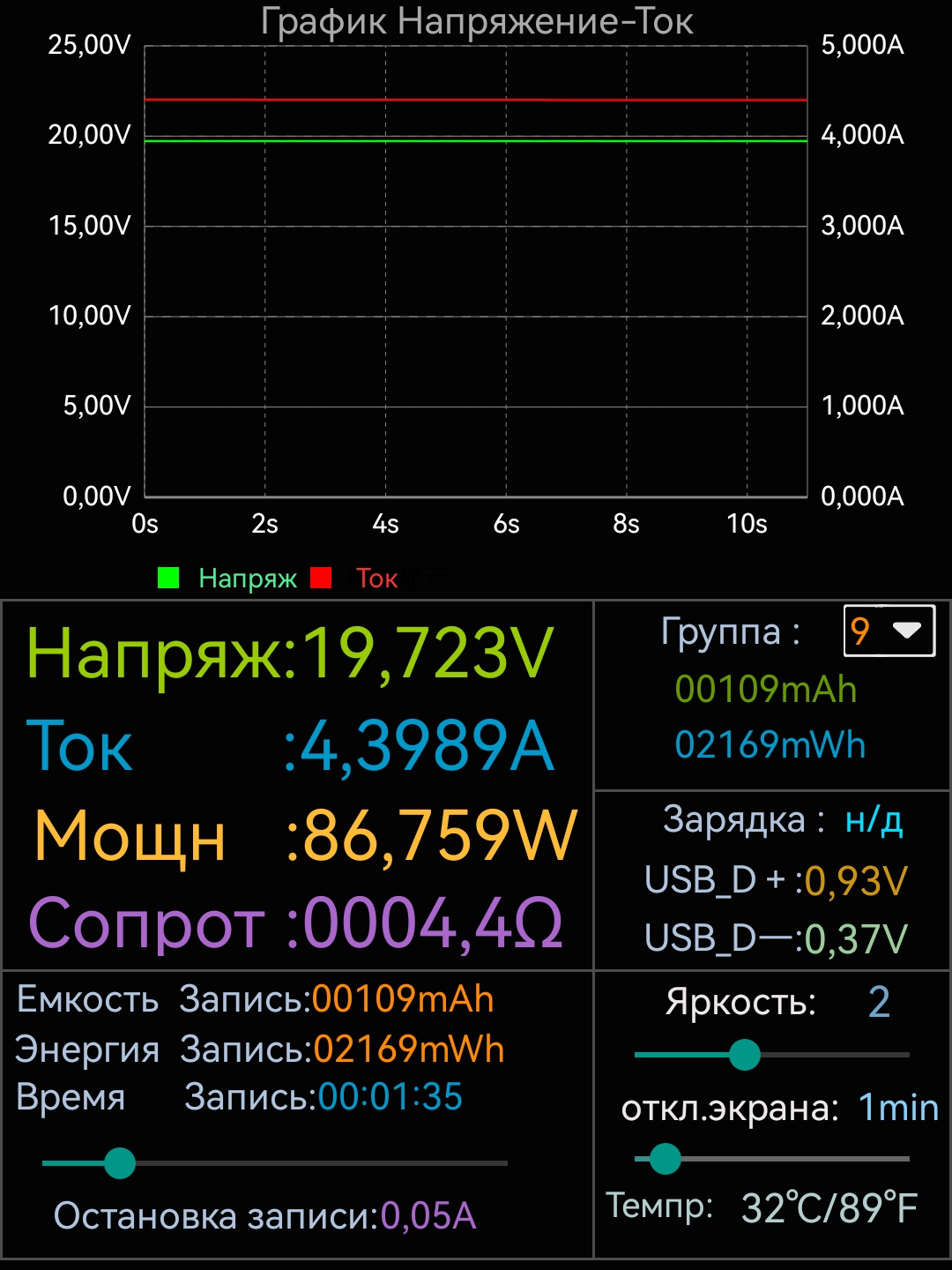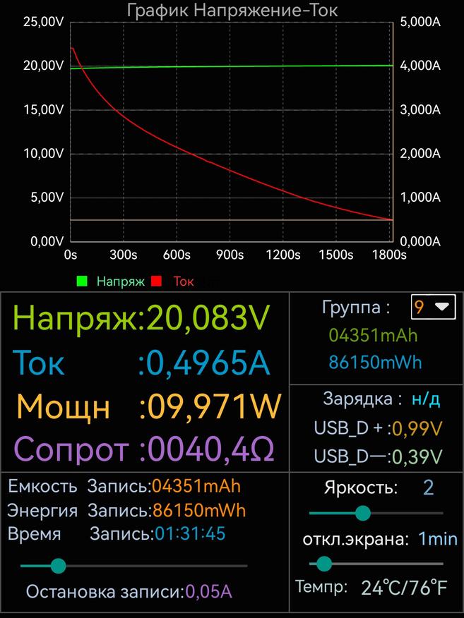По моим замерам заряжается пауэрбанк (при подаче питания на первый кабель) максимальной мощностью 86W. Эта мощность стабильно держится один час, после чего начинает очень плавно снижаться. За один час зарядки пауэрбанк потребляет 68200mWh, за полтора часа 86150mWh, а за 1 час и 49 минут (время на полную зарядку внешнего аккумулятора) 87821mAh.