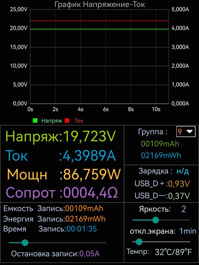 Внешний аккумулятор зарядил до 100%. USB-C Cable 1 подключил к ноутбуку, который способный потреблять по USB-C до 100W, а USB-C Cable 2 подключил к электронной нагрузке. Порт USB-C Cable 1 выдавал мощность 97.7W, а порт USB-C Cable 2 64W. Суммарно получилось 161W. Эта мощность держалась со ста процентов заряда пауэрбанка до 78 процентов. После чего на порте USB-C Cable 1 мощность упала до 68W и суммарно стало 132W. Когда пауэрбанк разрядился до 61 процентов, то на порте USB-C Cable 1 мощность снизилась до 45.6W, а порте USB-C Cable 2 до 44.3W. Суммарная выходная мощность составила 89W. При зарядке ноутбука мощностью 98W, мощность держится стабильно где-то со 100%.заряда внешнего аккумулятора до 16%. А далее снижается до 65W.