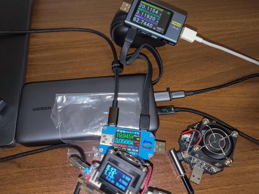 - USB-C Cable 1 + USB-C Cable 2 + USB-C + USB-A: 64.7W + 60.96W + 14W + 5.7W. Суммарно 145.3W. На фотографии видео что подключенный к USB-C Cable 1 тестер показывает 62.7W. Дело в том, что после повышения мощности до 64.7W пауэрбанк разрядился, и я не успел сделать фото. Ну и как выше уже упоминал — подключенный в качестве нагрузки (по USB-C Cable 1) ноутбук не берет более 60W. Так что заявление производителем суммарные 150W там вполне реальные.