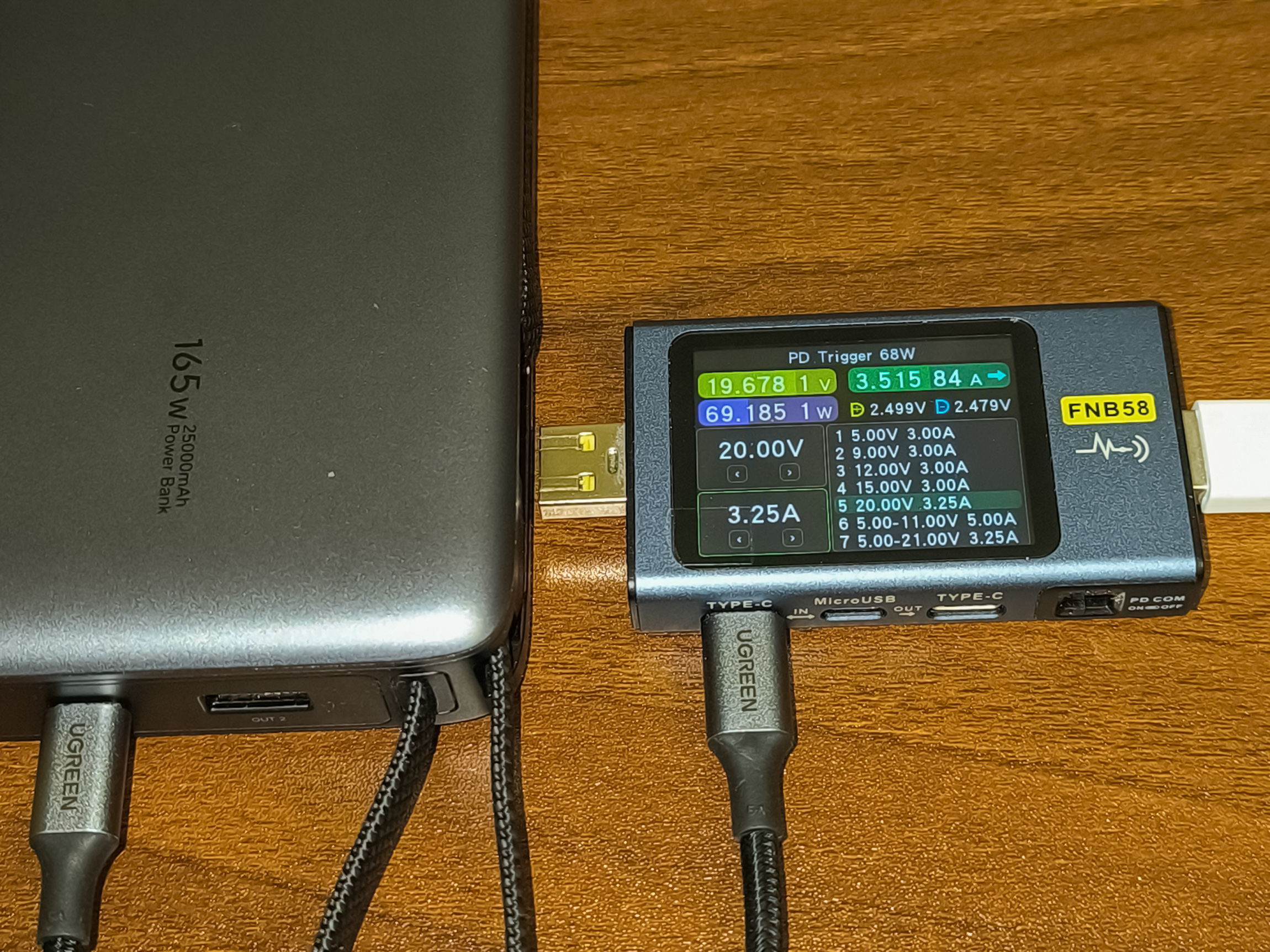 - Ugreen PB726: Оснащен одним встроенным кабелем длиною 65cm, который практически полностью прячется в корпус. А ещё он оснащен относительно большим информационным дисплеем, который предоставляет довольно много полезной информации. Ёмкость батареи у него 20000mAh. Общая максимальная мощность 165W, но на одном порту максимум может быть только 100W, а не 140W. Помимо кабеля, на борту имеется так же один порт USB-C и один USB-A. Пульсации очень низкие.
