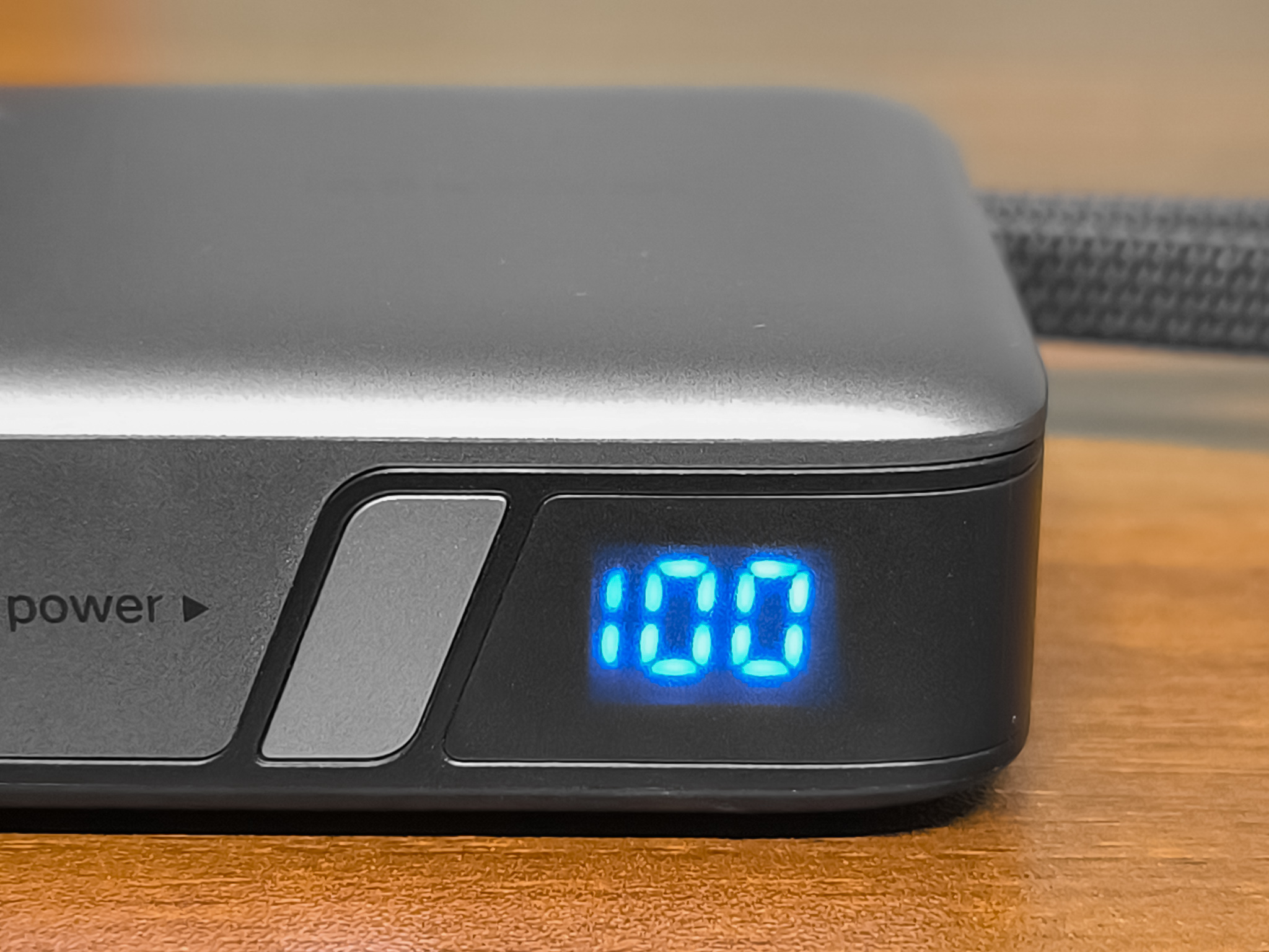 - На левой боковине размещён скрытый дисплей отображающий уровень заряда. Возле дисплея находится многофункциональная кнопка. Одиночное нажатие кнопки — показывает уровень заряда, а так же включает повербанк (если при подключении заряжаемого устройства вдруг автоматического включения не произошло). Двойное нажатие кнопки — выключает повербанк. Длительное нажатие кнопки (три секунды) — переводит пауэрбанк в режим зарядки малым током.