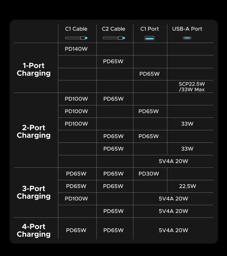 - USB-C Cable 1 + USB-C Cable 2 + USB-C + USB-A: 65W + 65W + 5V/4A 20W