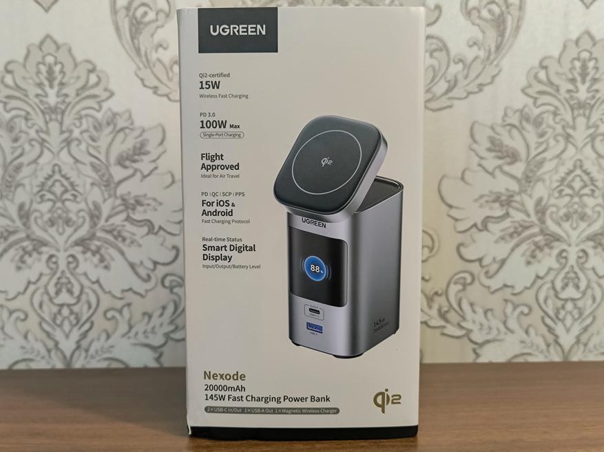- Ugreen PB771: Ёмкость 20000mAh, общая максимальная мощность 145W, максимальная мощность на одном порту 100W. Данный внешний аккумулятор оснащен информационным дисплеем (как у двух предыдущих пауэрбанков), двумя портами USB-C, одним портом USB-A и магнитной беспроводной зарядкой Qi2.