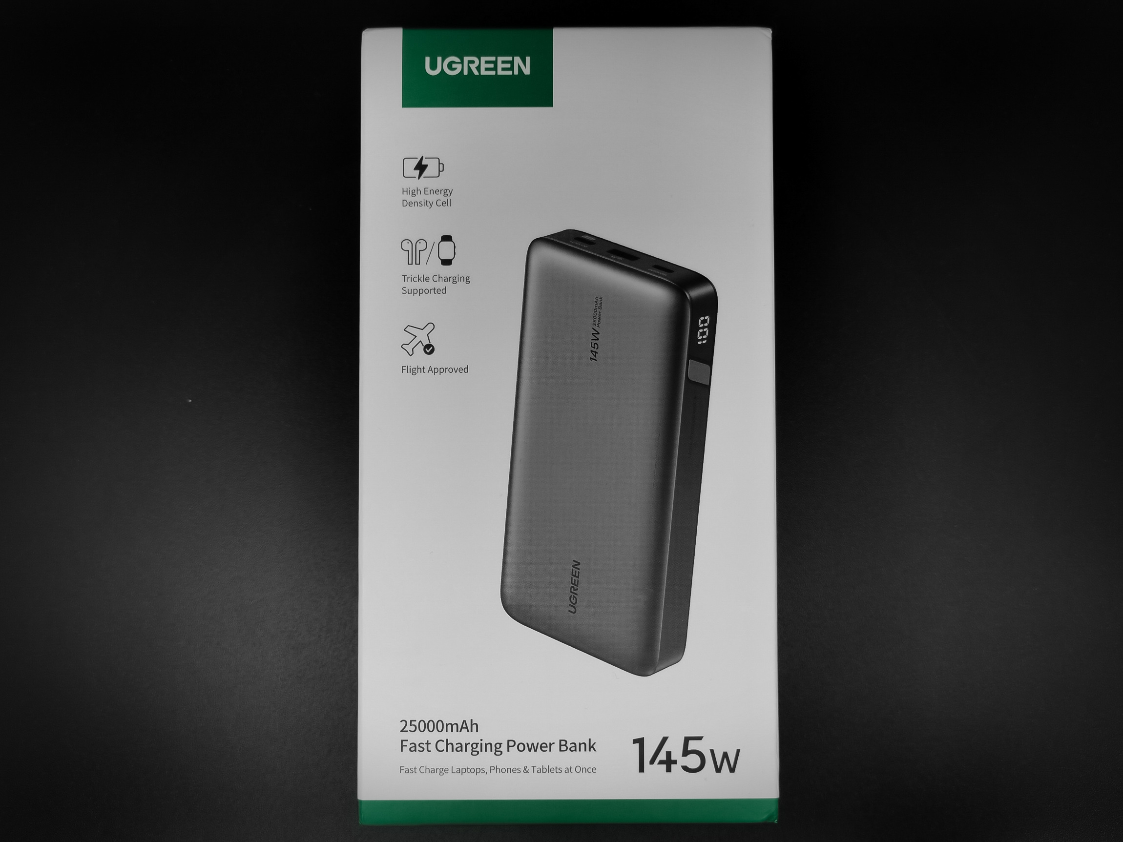 - Ugreen PB722: Внешне похож на предыдущий пауэрбанк: та же форма корпуса и имеется большой информационный дисплей, но он лишён встроенного кабеля. Ёмкость 25000mAh, общая максимальная мощность 200W, максимальная мощностью на одном порту 140W. Из портов есть два USB-C и один USB-A.
