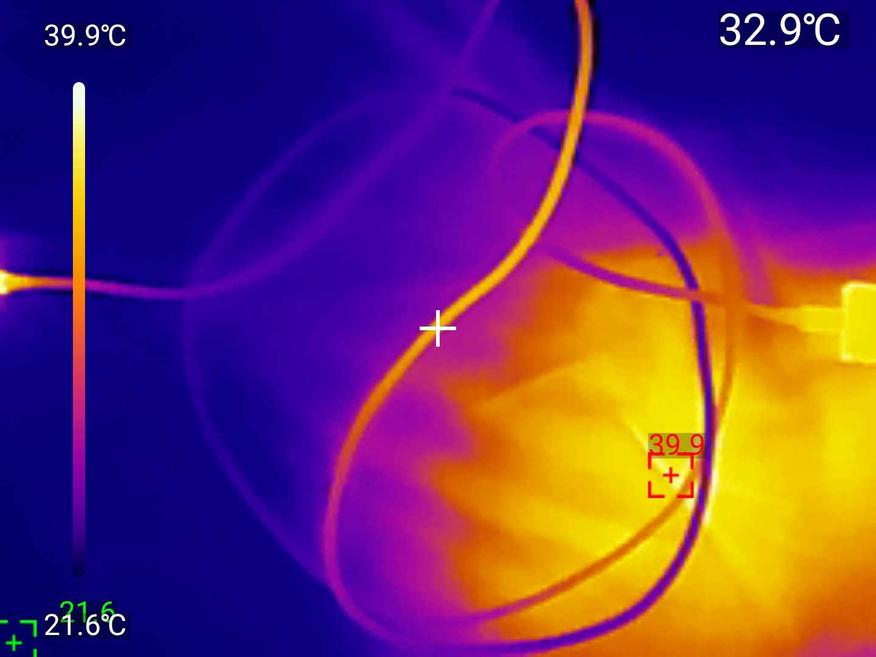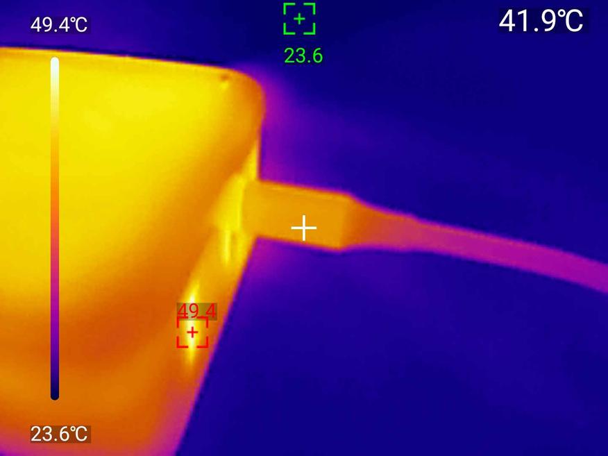 Самый важный тест — проверка на нагрев при максимальной мощности. Подключил к зарядному устройству на 140 Вт (хотя кабель заявлен на 100 Вт, решил посмотреть, что будет при запредельной нагрузке) и оставил на час. Термокамера показала: самая горячая точка — коннектор со стороны источника питания, разогрелся до 41,9°C. Сам кабель в середине держался в районе 30-33°C, второй штекер — около 23-24°C. Это нормальные значения для кабеля под высокой нагрузкой: ничего не оплавилось, оплётка осталась целой, а нагрев распределился равномерно. Для сравнения, у дешёвых «ноунейм» проводов бывает, что коннектор греется до 70°C и выше — тут же всё в пределах разумного.