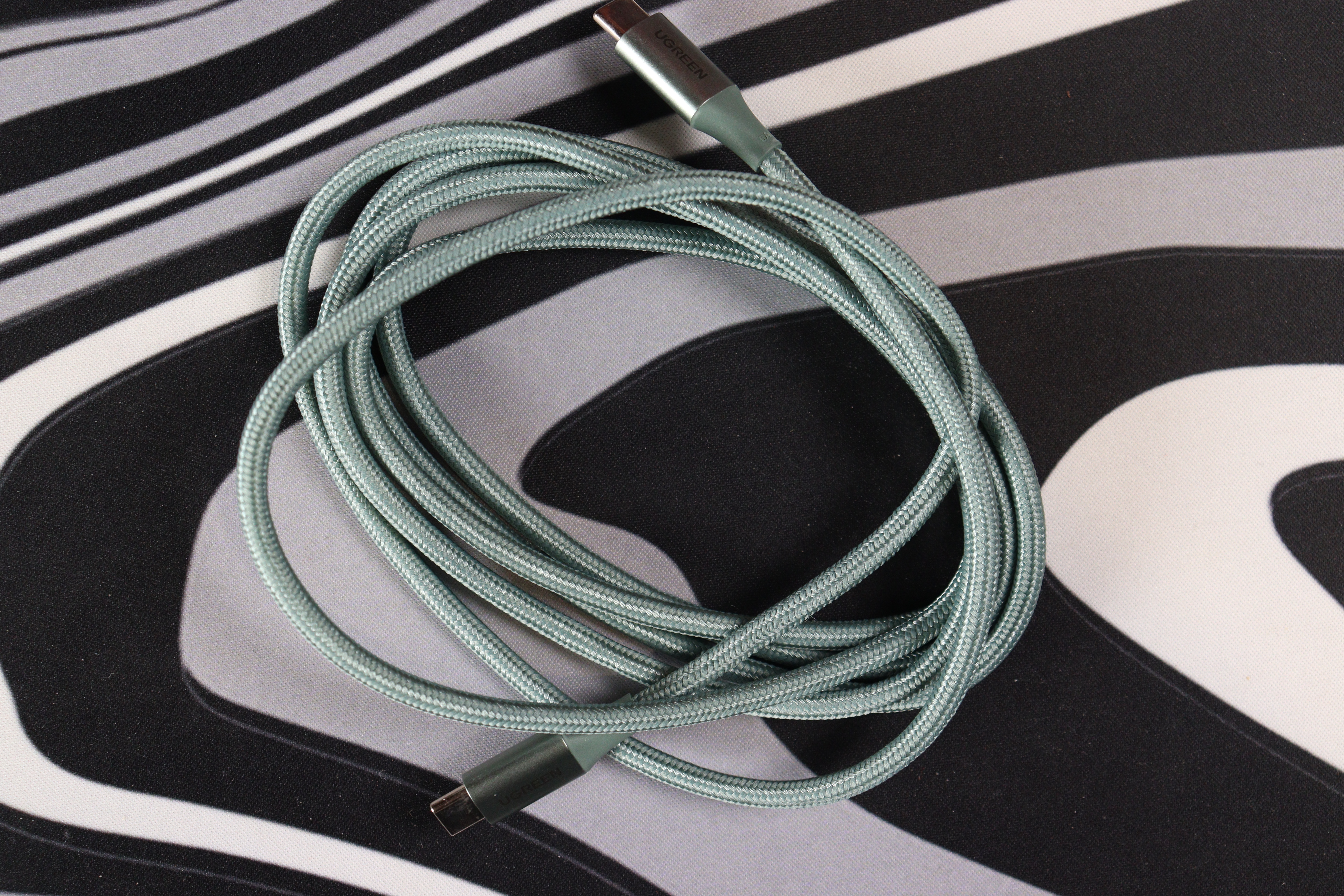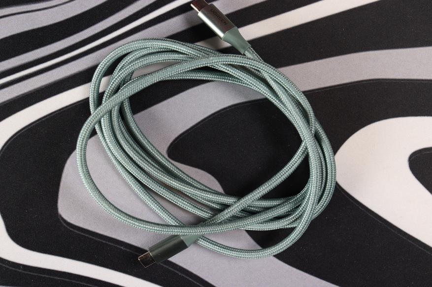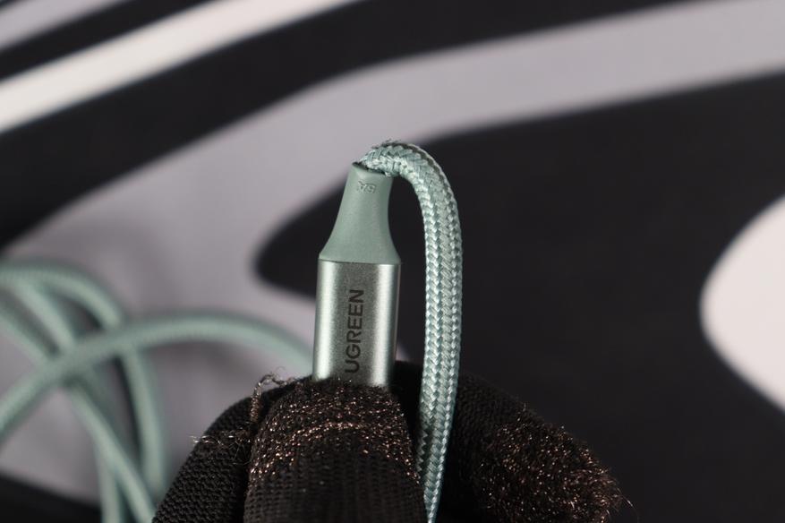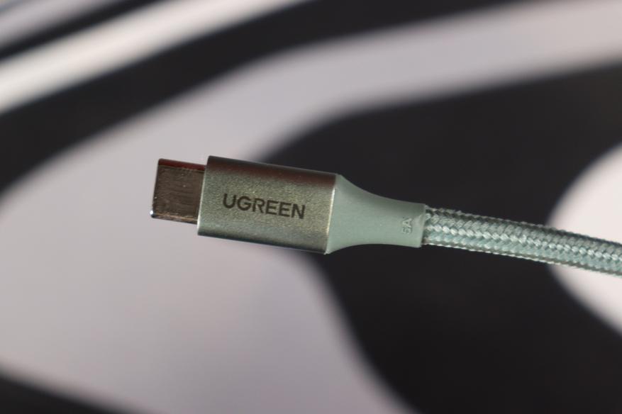 Первое, что бросается в глаза — необычный оттенок. Мятно-зелёный цвет смотрится свежо, особенно на фоне стандартных чёрных или белых проводов. Оплётка выполнена из плотного нейлона с мелким плетением, приятна на ощупь и не собирает пыль. Коннекторы алюминиевые, матовые, с лаконичной гравировкой «UGREEN» — никакого пластикового глянца. Места соединения штекера и кабеля усилены гибким кожухом, который защищает от переломов при частых изгибах. На одном из штекеров выбита маркировка «5A», что указывает на максимальный ток с учётом Power Delivery — полезная подсказка для тех, кто забывает спецификации. Длина в 2 метра даёт свободу действий: можно заряжать ноутбук, не привязываясь к розетке вплотную. По диаметру кабель чуть толще обычных «зарядников», но не настолько, чтобы быть неудобным — около 4 мм с оплёткой.