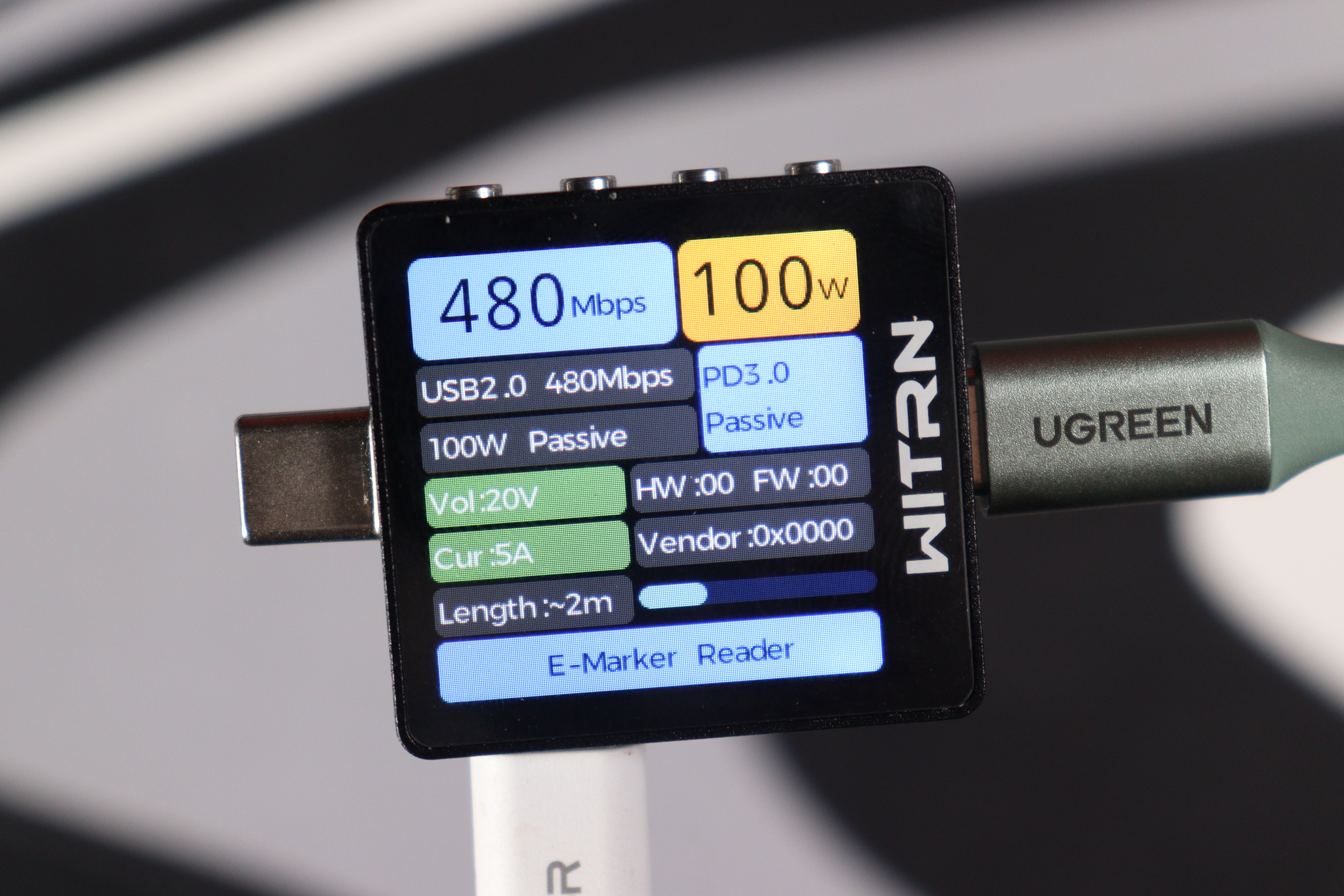 Тестирование начал с подключения к USB-тестеру. Кабель без проблем установил связь и активировал PD 3.0 с напряжением 20 В. На экране тестера высветилось: USB 2.0 на 480 Мбит/с, пассивный кабель, поддержка до 100 Вт, длина ~2 метра, E-Marker присутствует. Все параметры совпали с заявленными на упаковке — производитель не привирает.