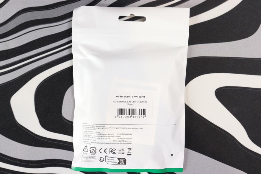 Кабель поставляется в простой белой упаковке с прозрачным окошком спереди. Через него видно смотанный провод — никаких сюрпризов или лишних элементов. На обратной стороне указаны основные характеристики: модель US316, длина 2 метра, поддержка 100 Вт и USB 2.0 на скорости 480 Мбит/с. Кроме самого кабеля, внутри лежит небольшая пластиковая стяжка для транспортировки провода — удобная мелочь для хранения.