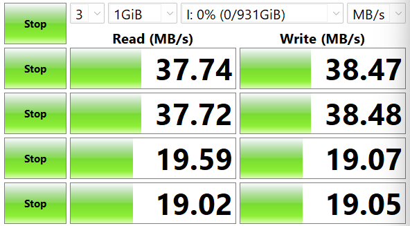 Подключил кабель к внешнему SSD CM559 и прогнал тест в CrystalDiskMark. Результаты ожидаемо скромные: чтение и запись на уровне 37-38 МБ/с для крупных файлов и около 19 МБ/с для мелких. Это типичная производительность USB 2.0 — стандарт 480 Мбит/с даёт теоретически до 60 МБ/с, но на практике выходит меньше из-за накладных расходов протокола. Для синхронизации фото или документов сойдёт, но если нужно регулярно перекидывать большие объёмы данных — лучше взять кабель с USB 3.2 или Thunderbolt.