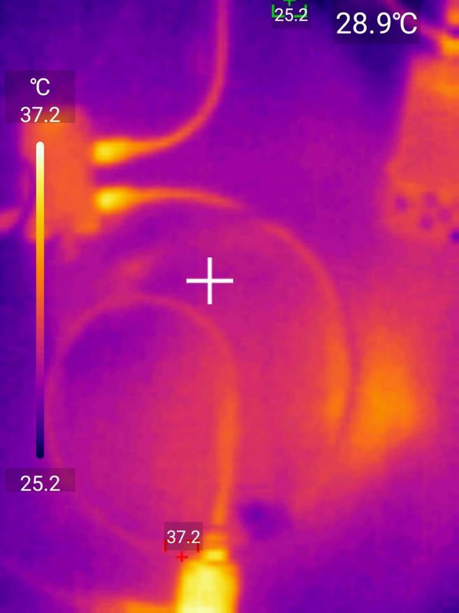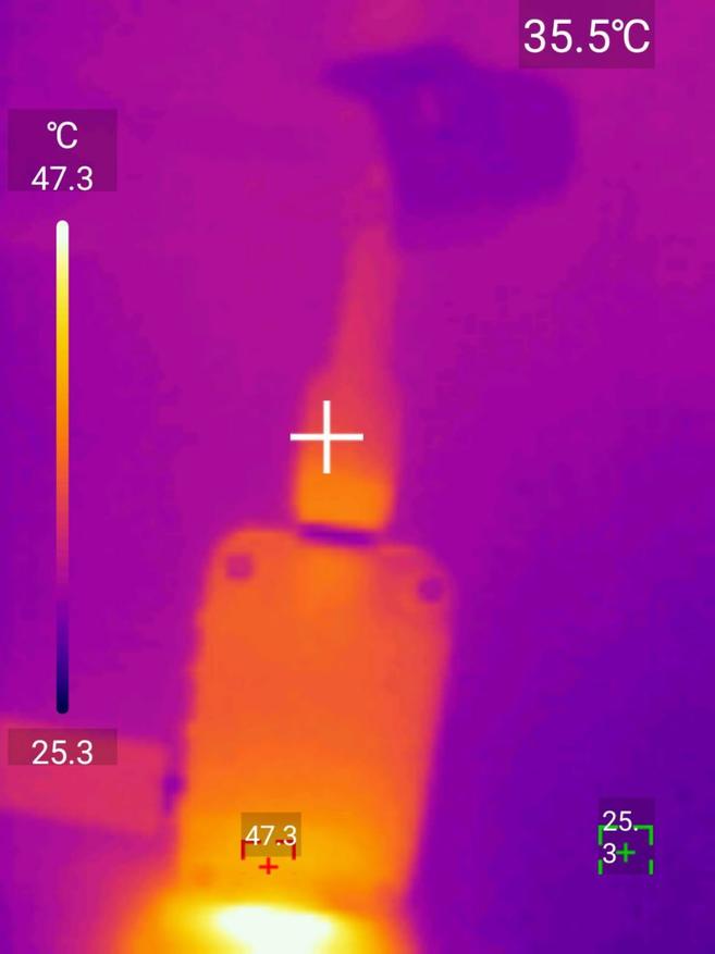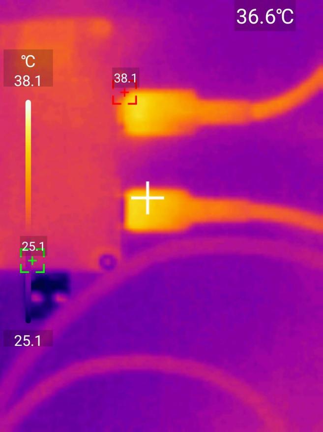 Дабы проверить как кабель ведет себя в реальных тестах, проведено стресс-тест длительностью 30 минут на максимальную заявленную мощность передачи - 100 Вт. Для получения тепловых снимков нагрева кабеля и коннекторов использовался тепловизор UNI-T 120 Mobile.