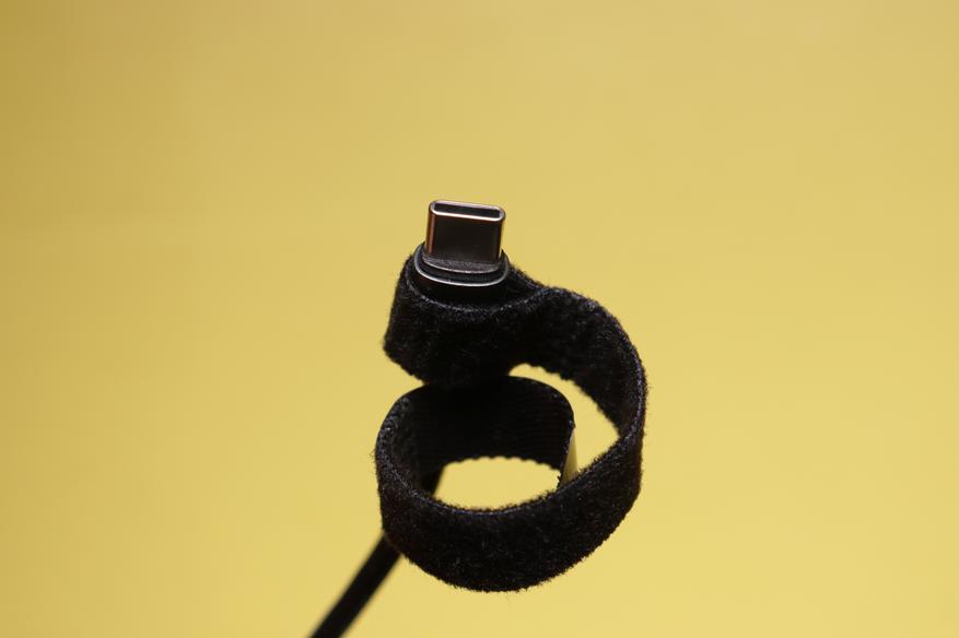 Не забыл производитель и о защите от перегиба, которая отлично адаптируется под угол заламывания, что также продлит срок службы. Длинна самого кабеля - ровно метр, длинна коннектора с защитой от перегиба составляет ровно 3 сантиметра, что совокупно дает длину кабеля в районе 106 см. Дополнительно кабель оснащен лентой липучкой для удобного сматывания кабеля.